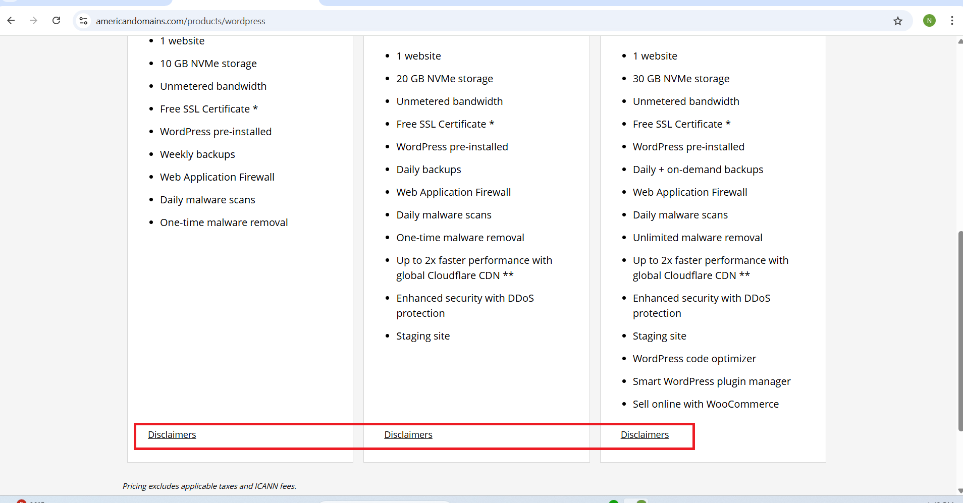 * In the Top Header section under Websites / Security / Hosting subfields, when the user hovers over the “Disclaimer” link, it does not visually highlight (e.g., no color change)