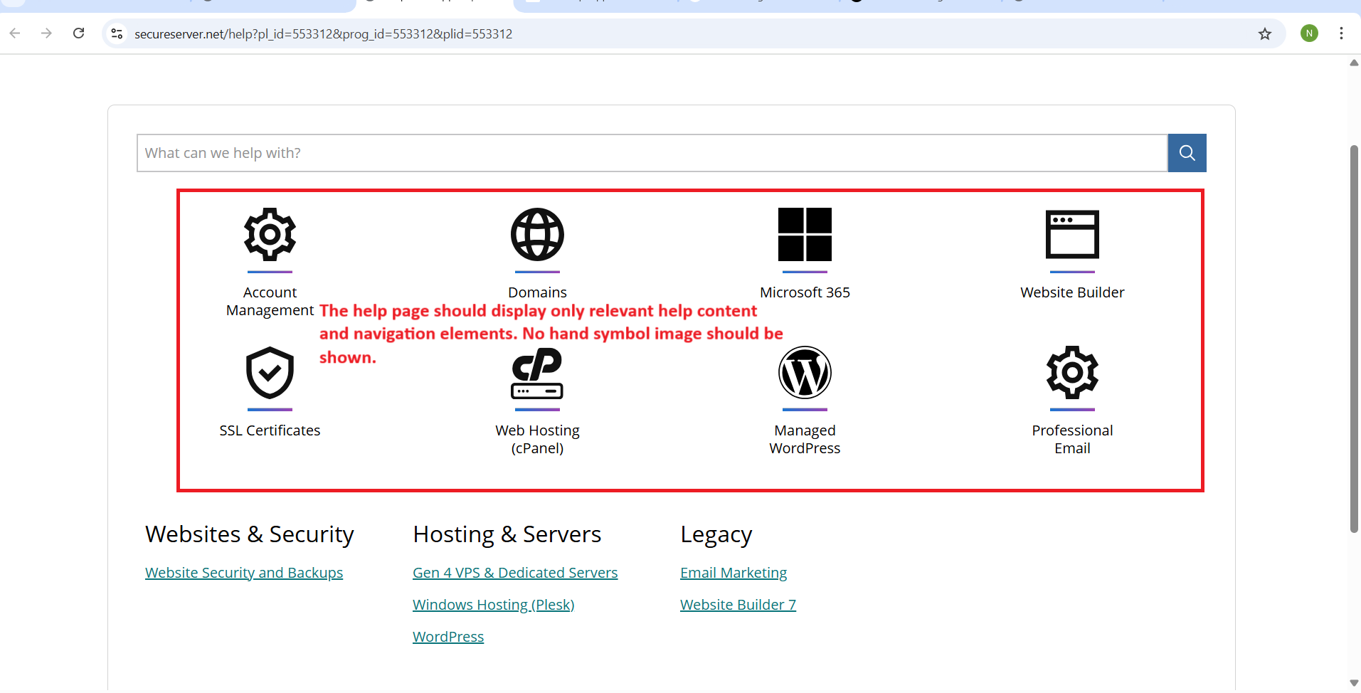 - Instead, the Help page should display only relevant help content and navigation elements. No hand symbol image should be shown.