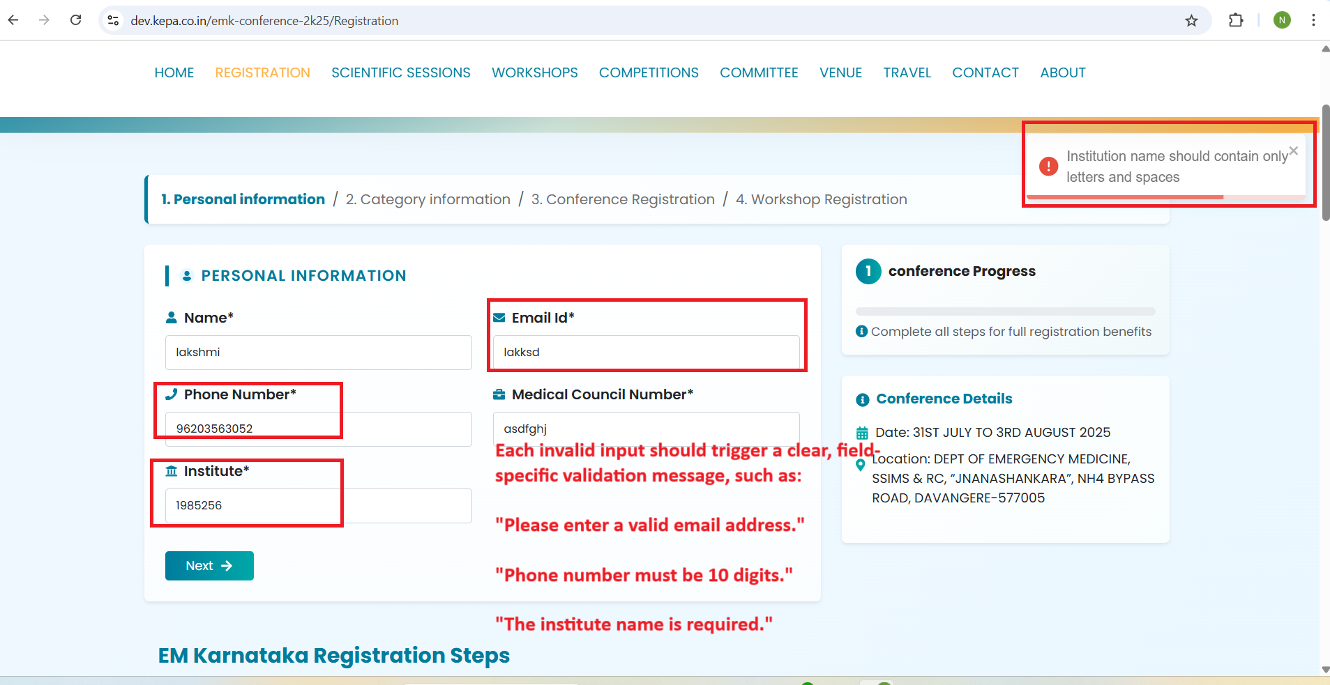 Enter invalid details on the email ID, Phone Number, and Institute (leave it blank or enter invalid characters). Click on the Next button. Validation messages are displayed incorrectly, showing that the Institution name should contain only letters and spaces.