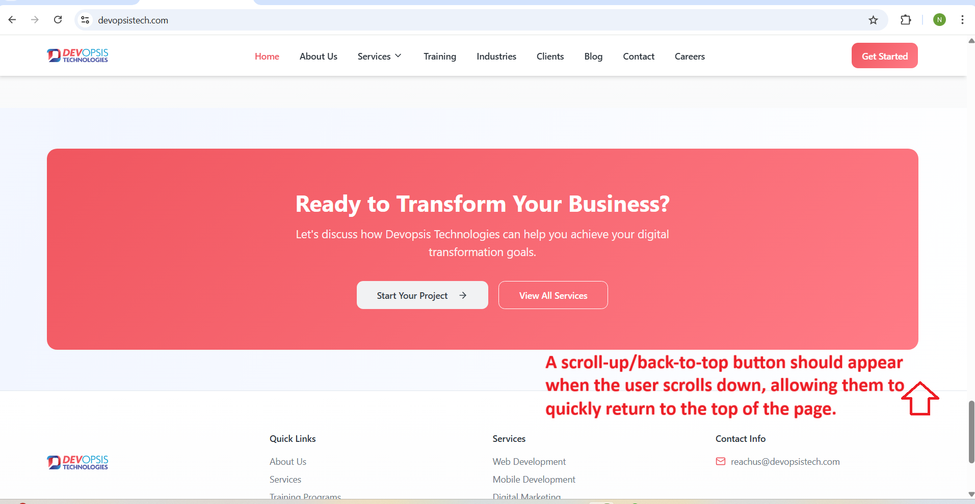 openFor all website pages (e.g., Home, About Us, Services, Contact, Careers, etc.) pages – scroll-up button is missing issue: