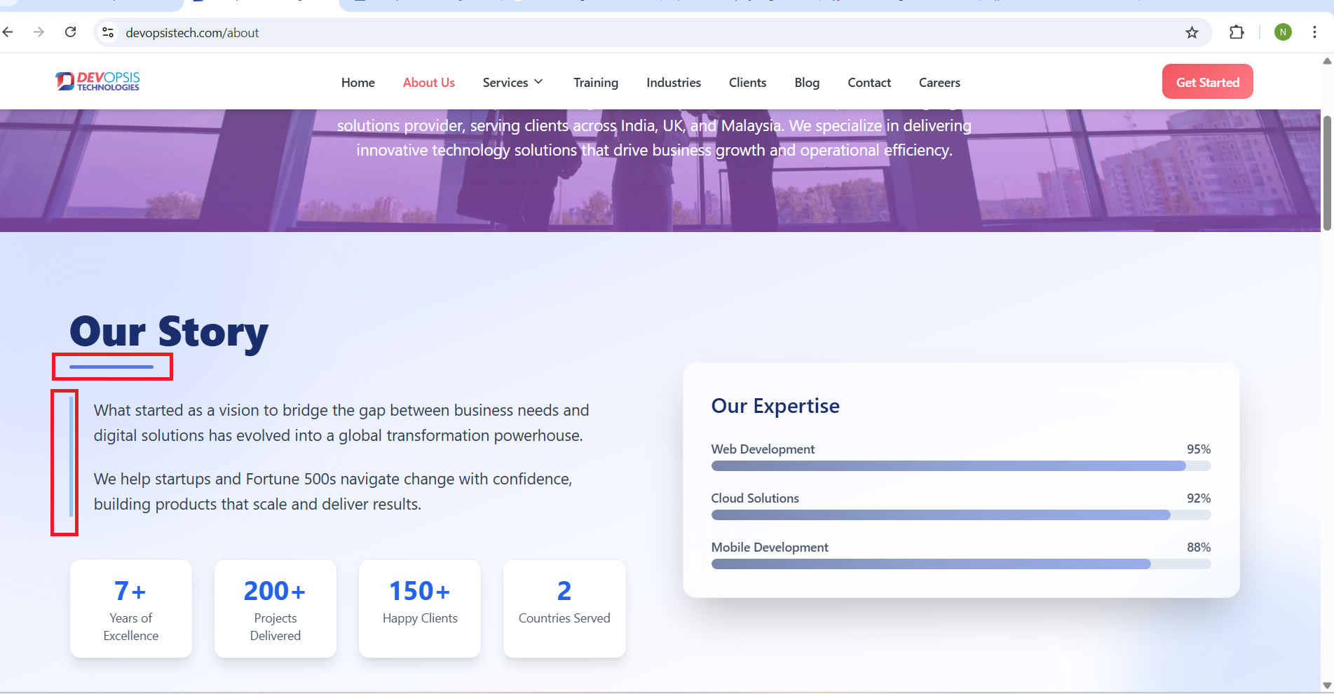 openAbout us page –Our story section, Unintended Vertical and Horizontal Blue Line Display issue: