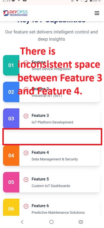- Scroll down to the Key IoT Capabilities section. There is inconsistent space between Feature 3 and Feature 4.