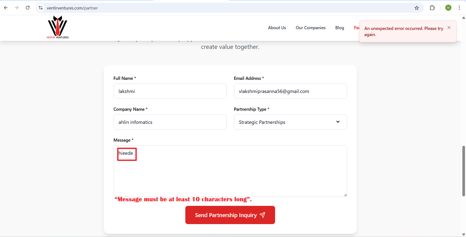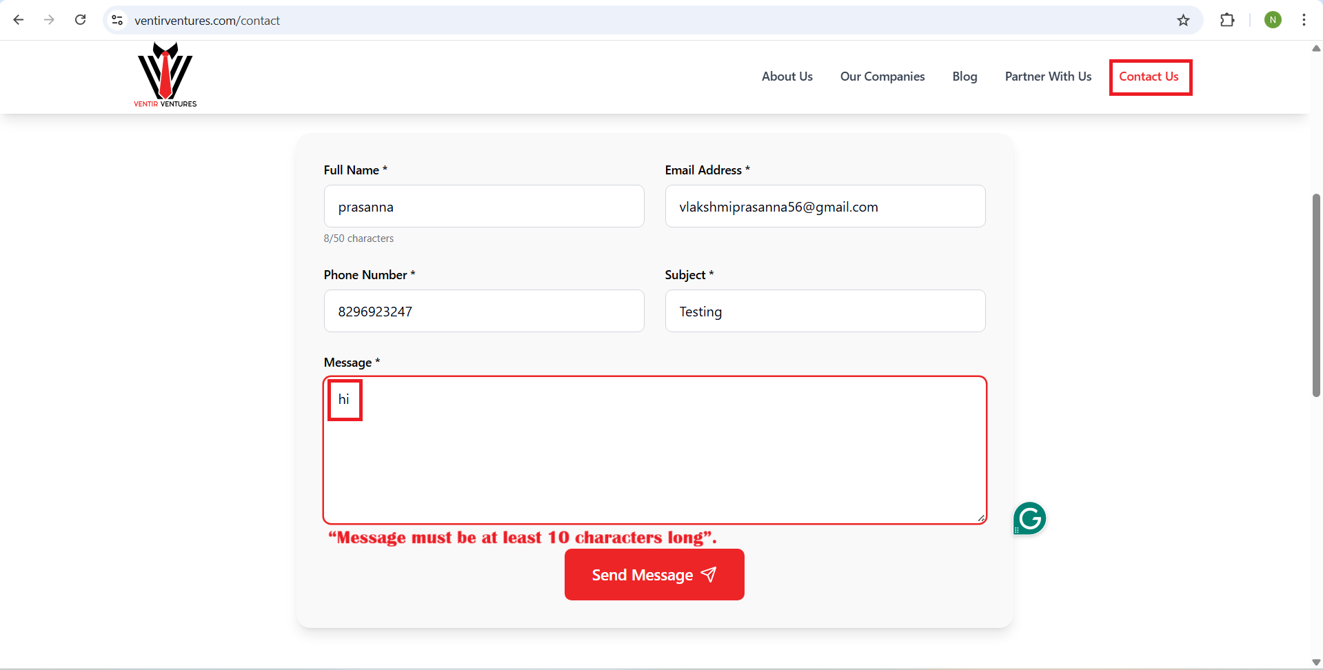 openPartners With Us /Contact Us pages / – scroll down -- Send Us a Message section – Message field validation not triggered when entering less than minimum characters issue: