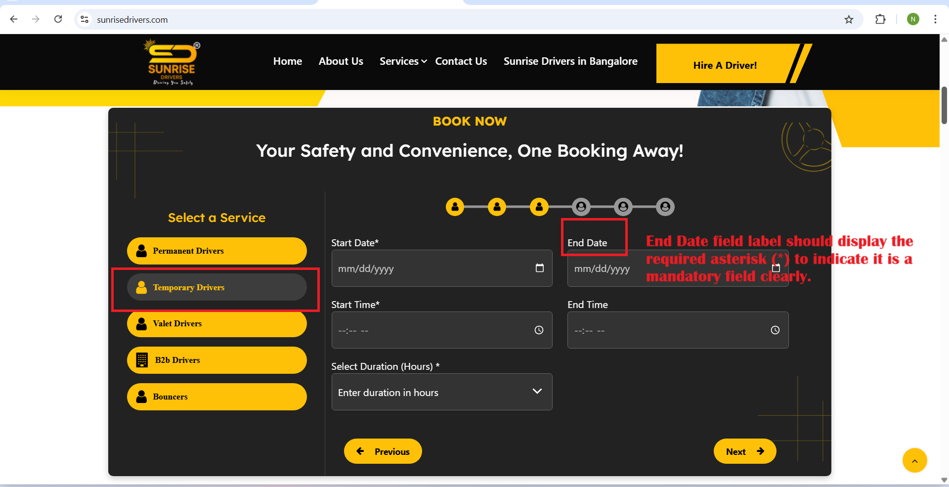 openHome page scroll down -- Select The Temporary Drivers – step3 page End Date star mark missing issue: