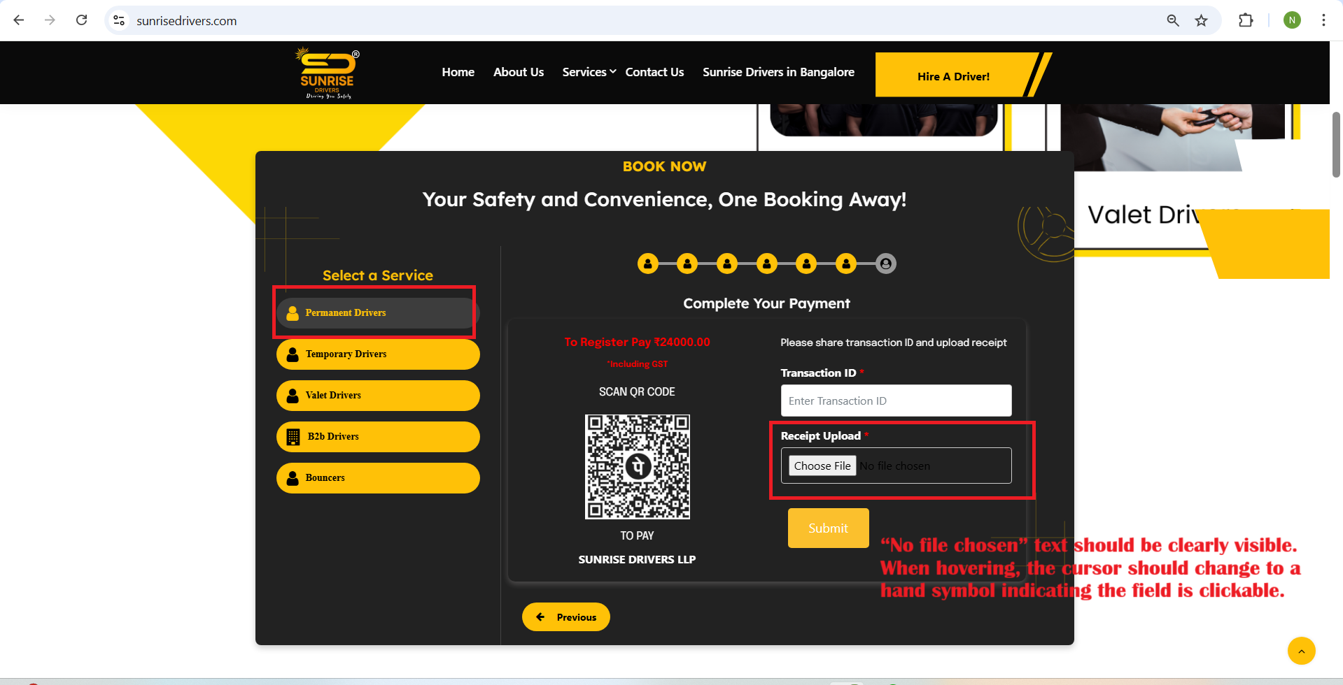 - Select the Permanent Drivers. Fill in all the required fields until the payment section. In the Complete Your Payment section, locate the Receipt Upload field. The “No file chosen” text is not clearly visible. The cursor displays as a normal arrow instead of a hand symbol.