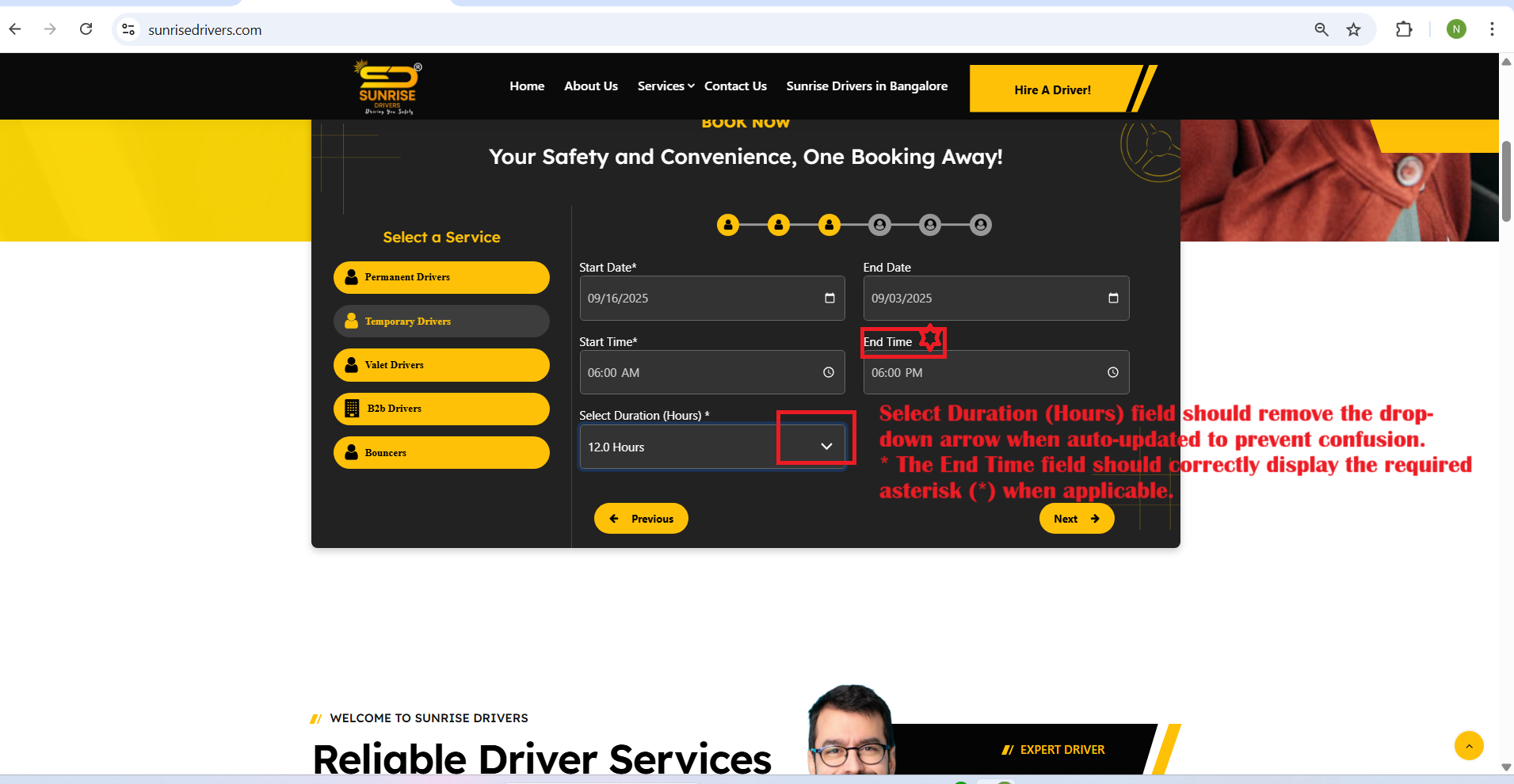 openHome/Booking page -- select the Temporary Drivers – Duration field shows a dropdown arrow after auto-population, and the End Time required asterisk is missing issue: