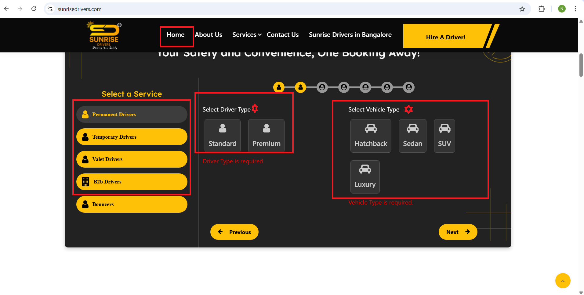openHome /Booking pages – select a service -- Permanent, B2B, Temporary, Valet Drivers – step 2 section Select a driver type and Select Vehicle Type required fields star mark is missing issue: