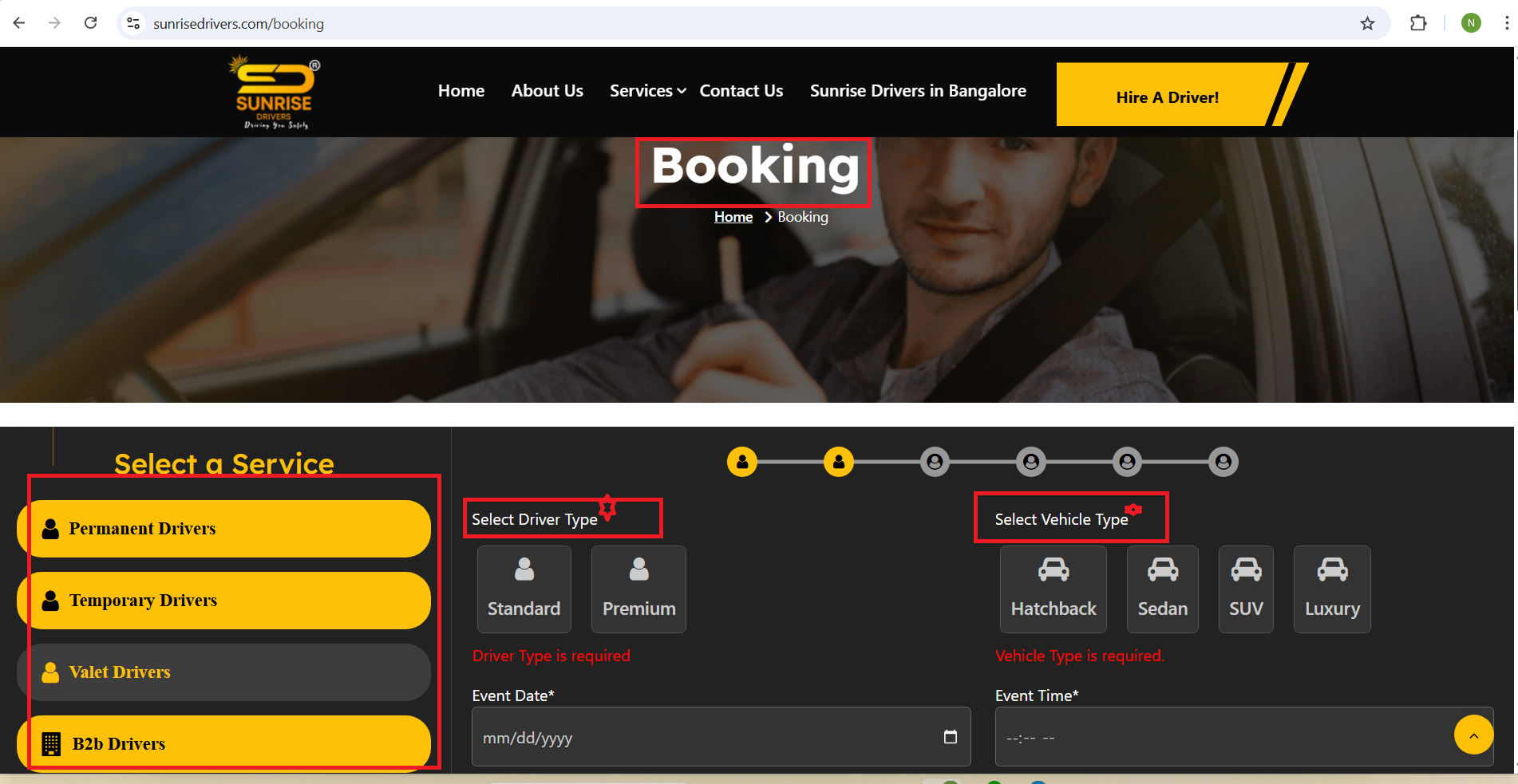 - The “Select a Driver Type” and “Select Vehicle Type” fields are mandatory, but the required field star (*) is missing.