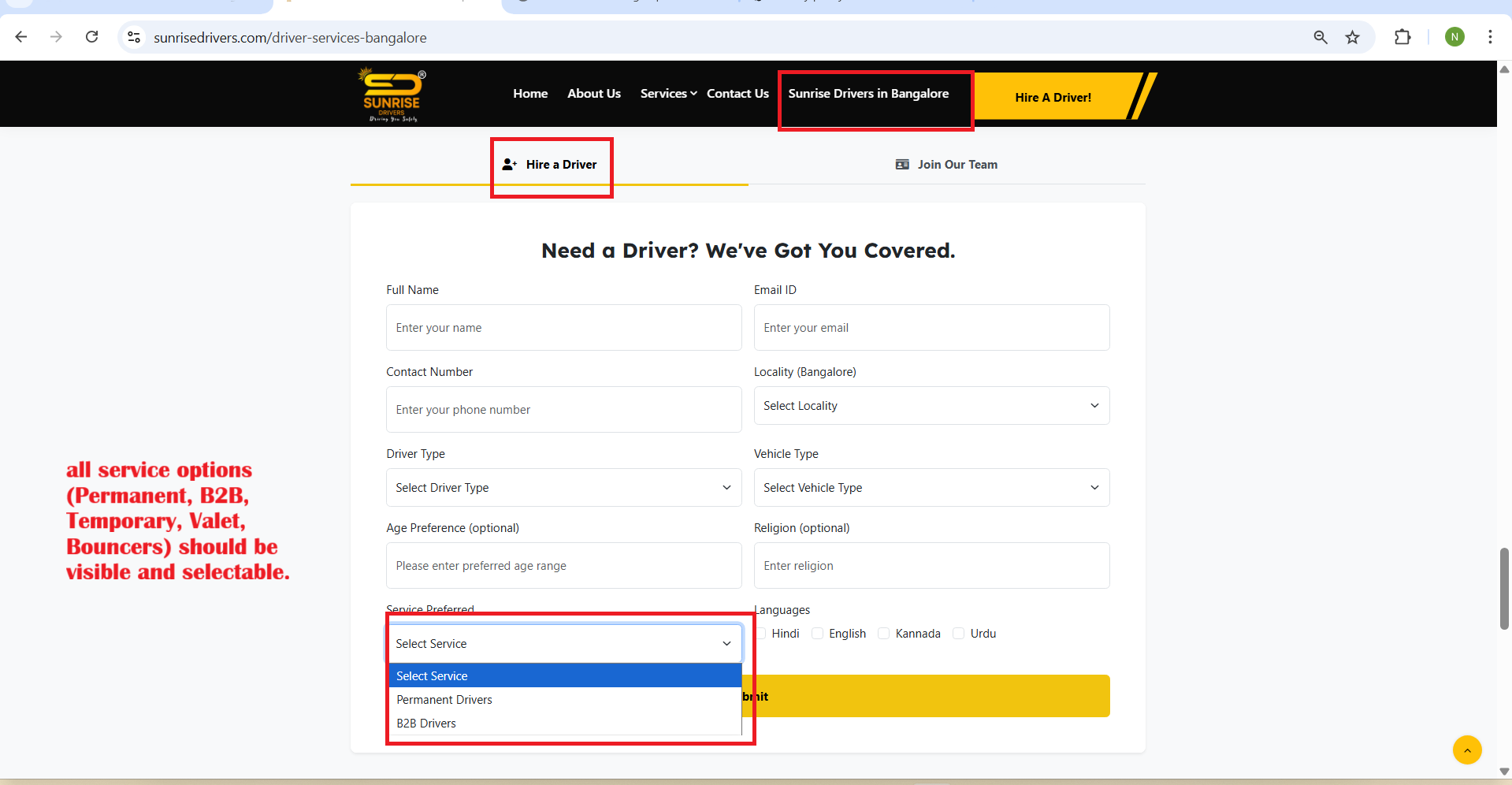 openTop of the header clicks on the Sunrise Drivers in Bangalore page – scroll down the Get Started Today section – Hire a Driver Form – Services Dropdown Not Showing All Options issue:
