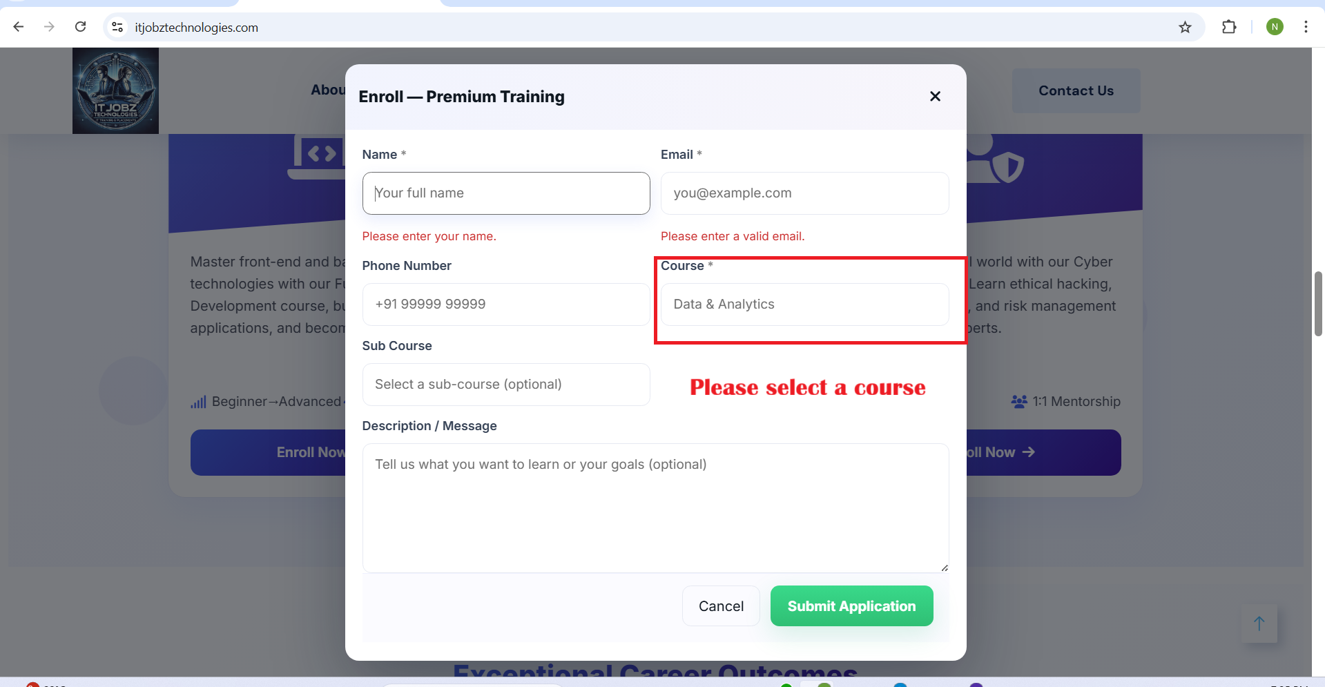 (Home Page) Premium Training Programs –clicks on the Enroll Now button, course field validation message missing issue: