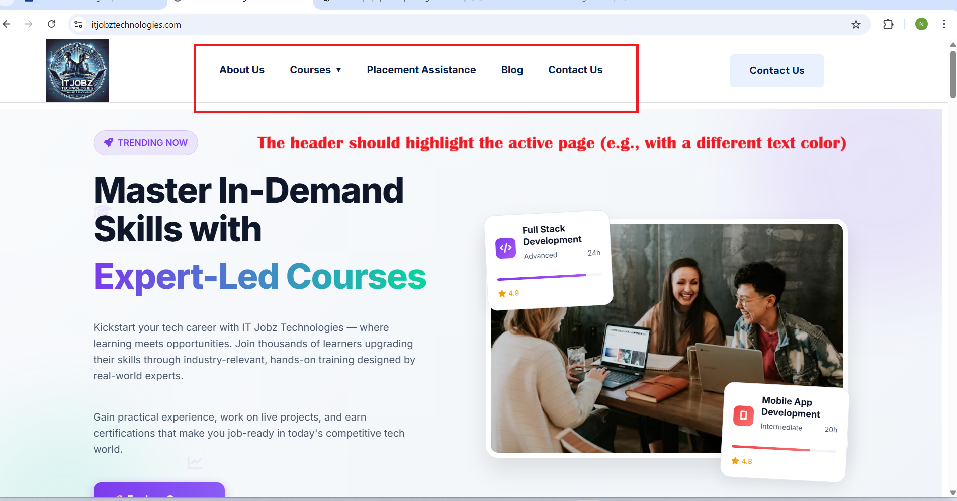 * When the user clicks on any menu item, the selected page link is not highlighted in the header. The navigation bar does not visually indicate which page is currently active.