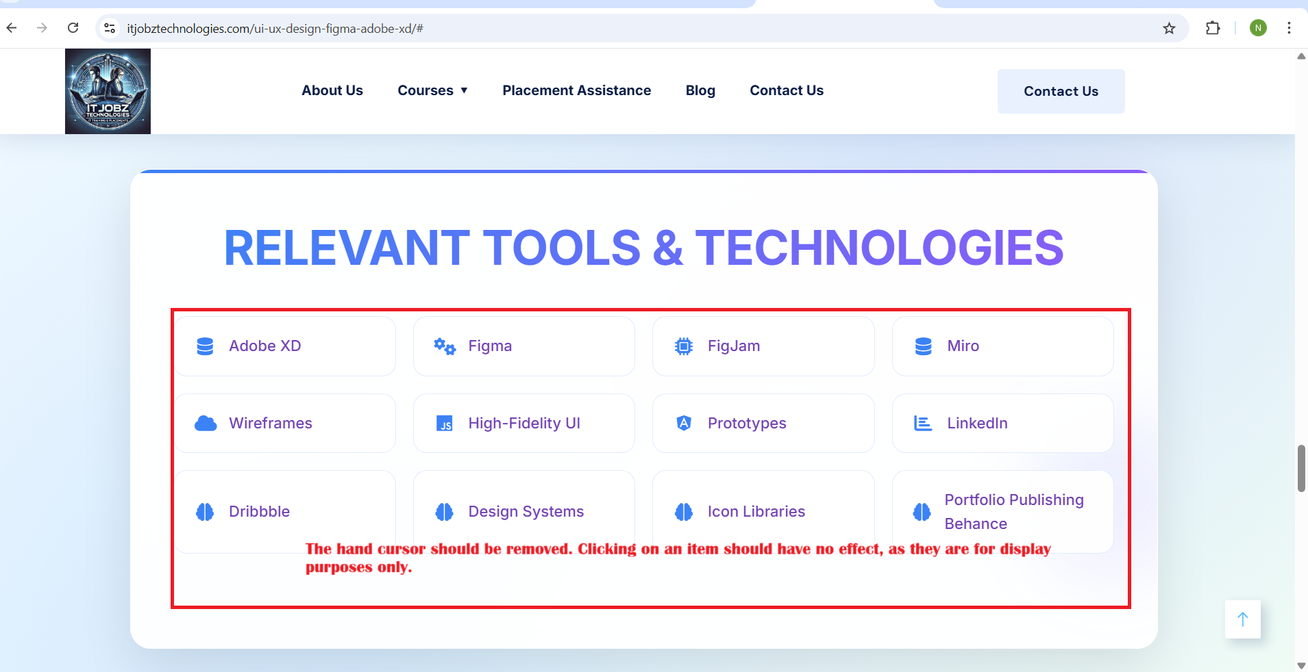 - Instead, the tools and technologies should not be clickable. No navigation or scroll action should occur. The hand cursor should be removed. Clicking on an item should have no effect, as they are for display purposes only.