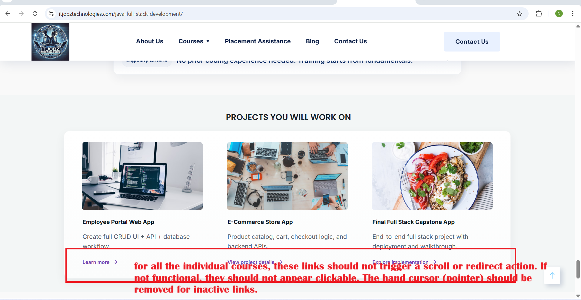 - Instead, for all the individual courses, these links should not trigger a scroll or redirect action. If not functional, they should not appear clickable. The hand cursor (pointer) should be removed for inactive links.