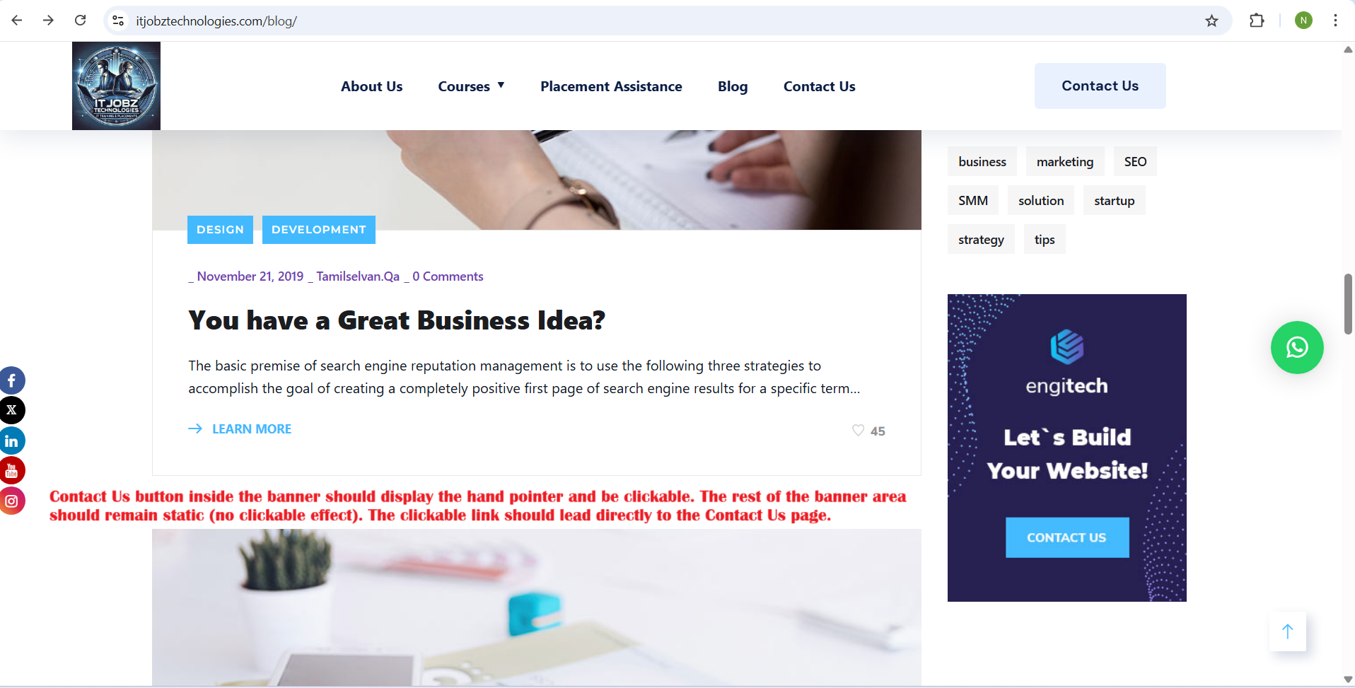 openBlog page – Right-side “Engitech Let’s Build Your Website” ad banner shows a hand symbol; clickable redirect issue: