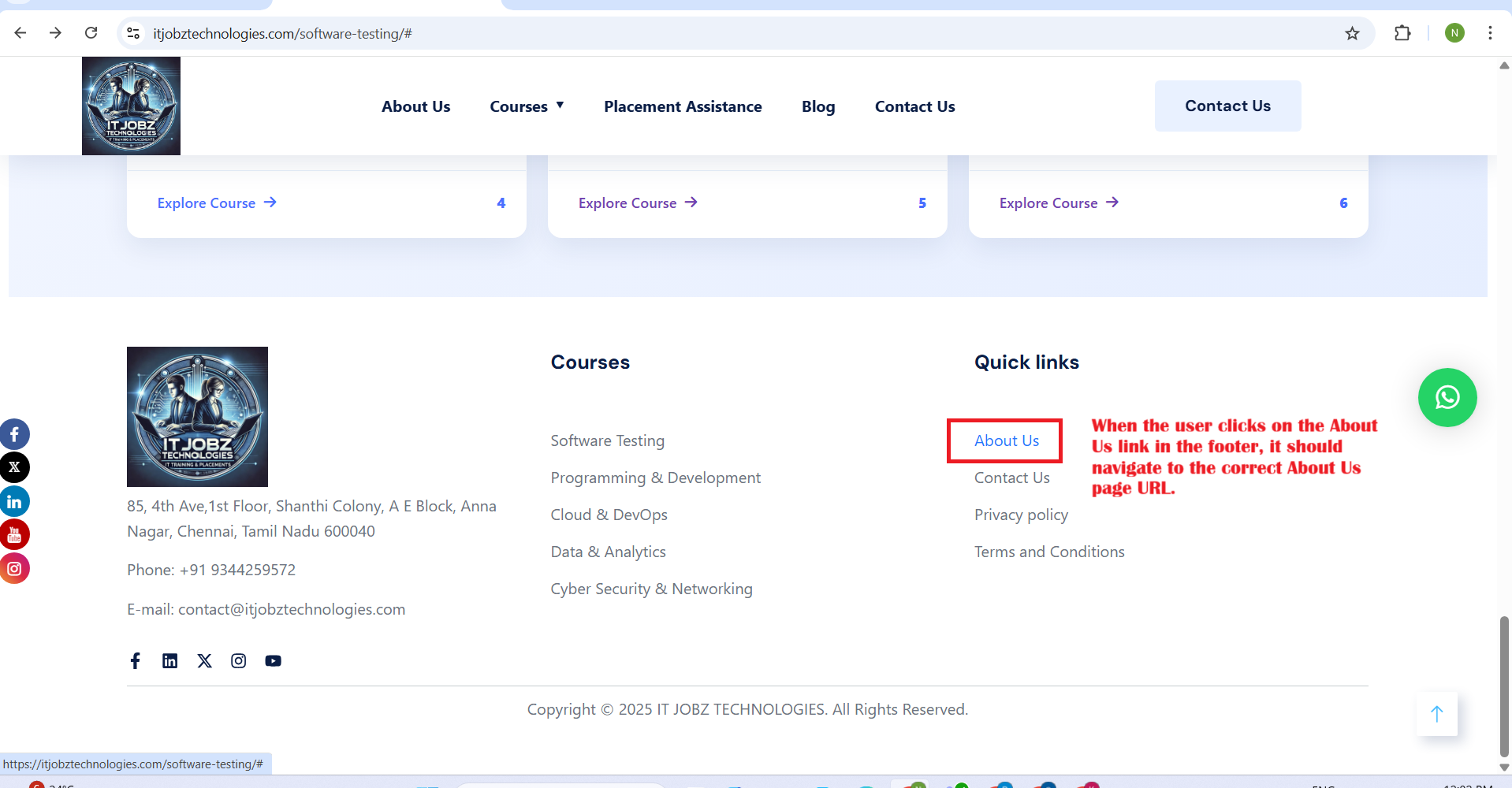 - Instead, when the user clicks on the About Us link in the footer, it should navigate to the correct About Us page URL.