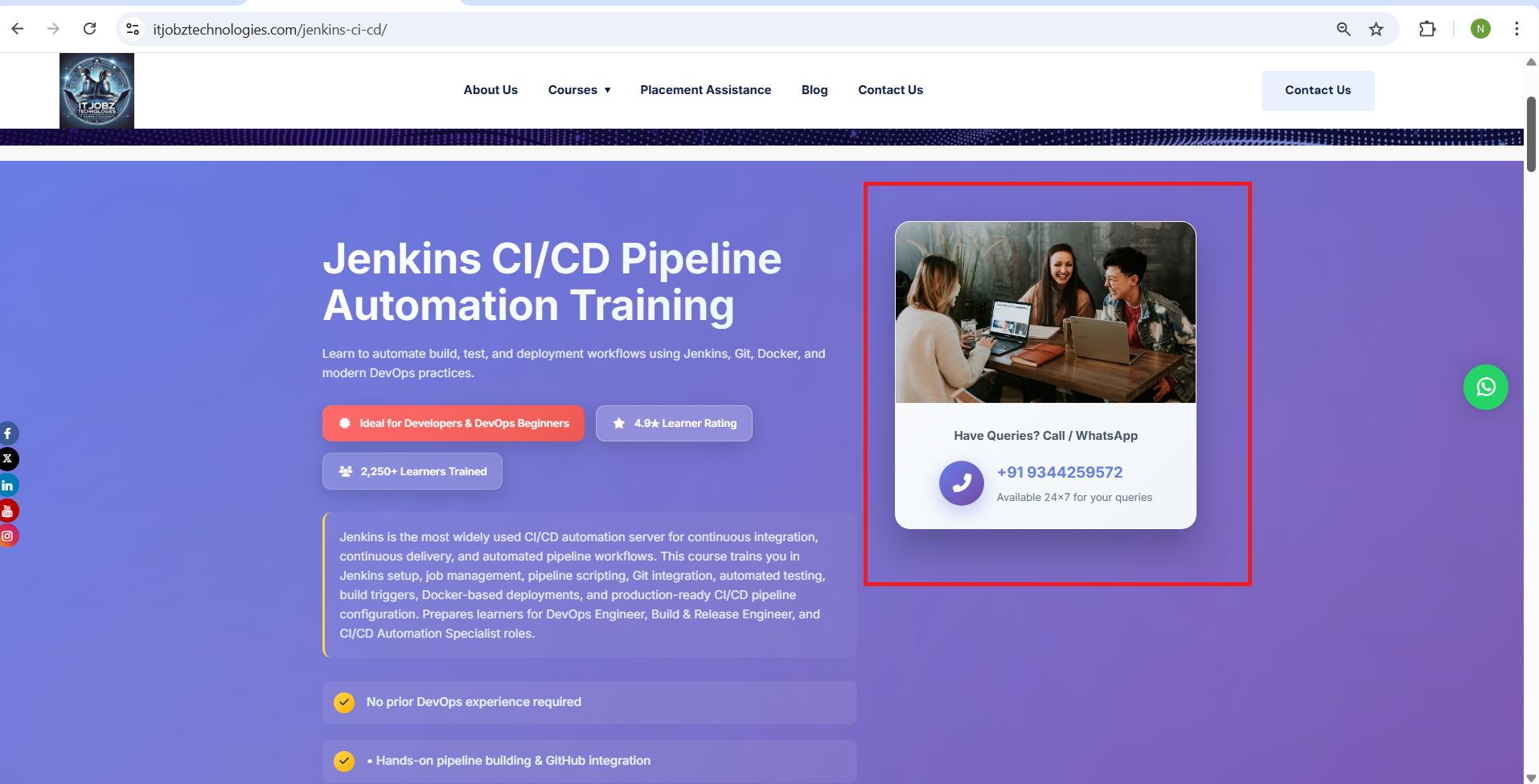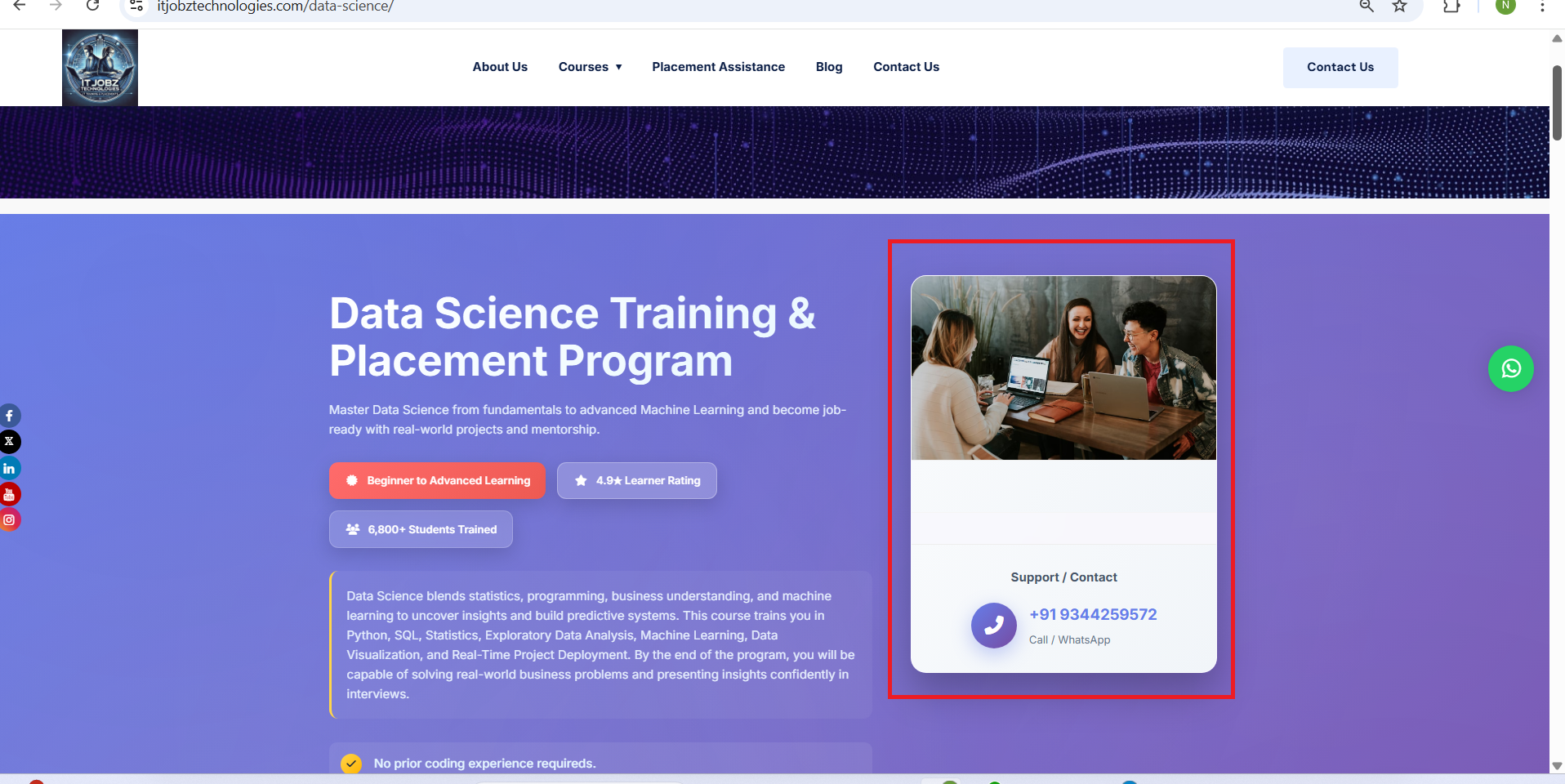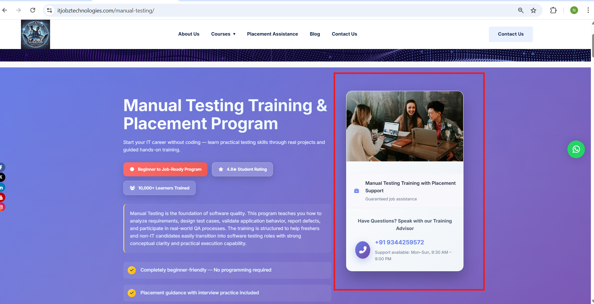 - The right-side info card shows different labels, different support details, different timings, and different descriptions on each course page.