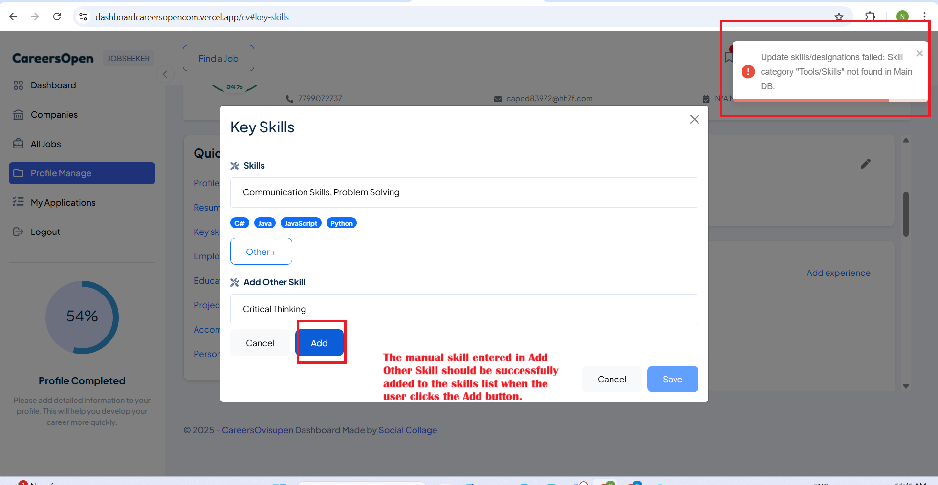 * When the user manually enters a skill in the Skill field and another skill in the “Add Other Skill” field and clicks the Add button, an incorrect validation message appears: “Skill category 'Tools/Skills' not found in Main DB.”