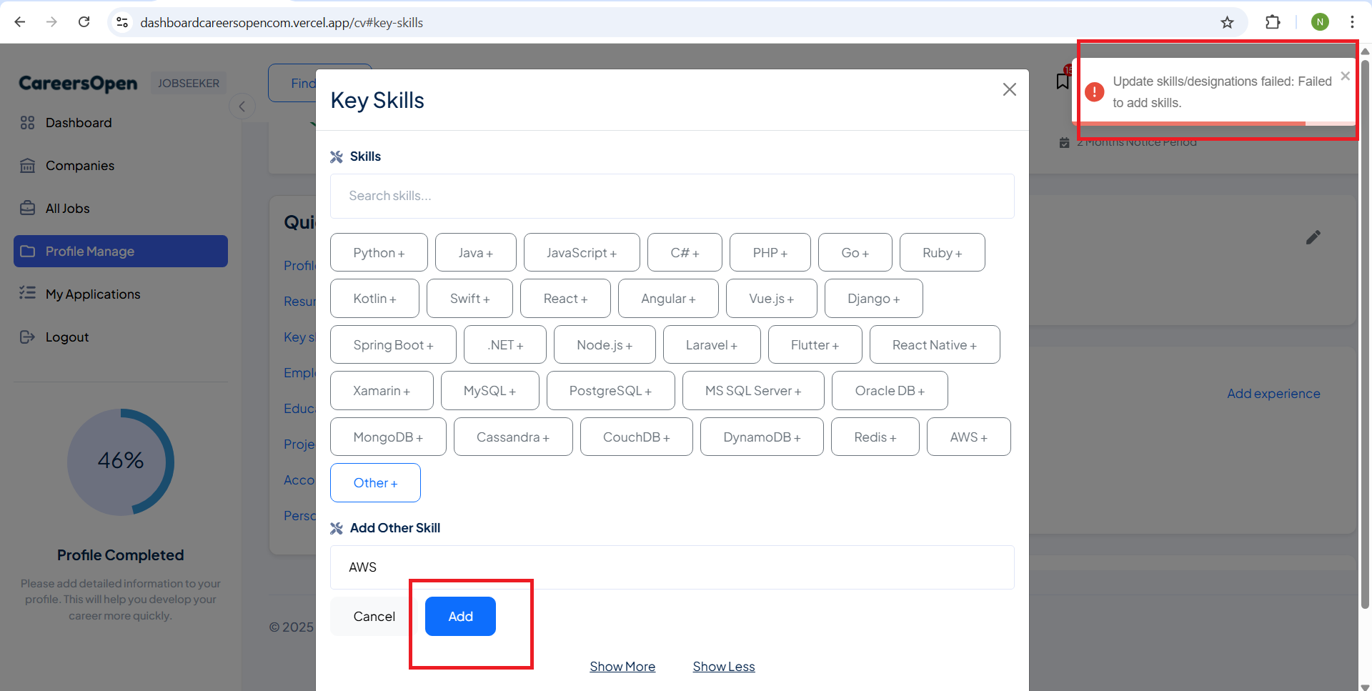 When clicking the Add button in the Key Skills section, the skill gets added successfully, but an error/validation message is shown at the top-right of the page.