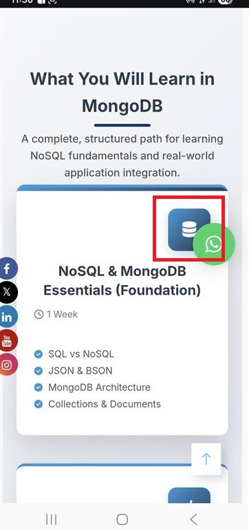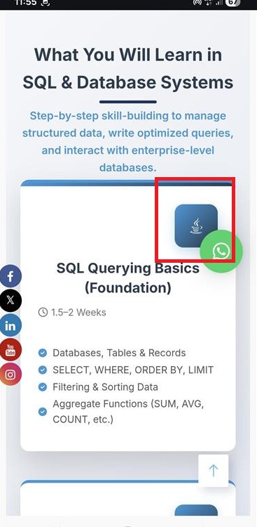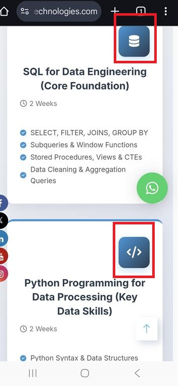 open(Mobile Browser) Data Science & Analytics-- sub-categories SQL / MySQL / Oracle / PostgreSQL/ MongoDB/ Data Engineering with Python & SQL pages – scroll down “What You Will Learn” Section Icons Misaligned issue: