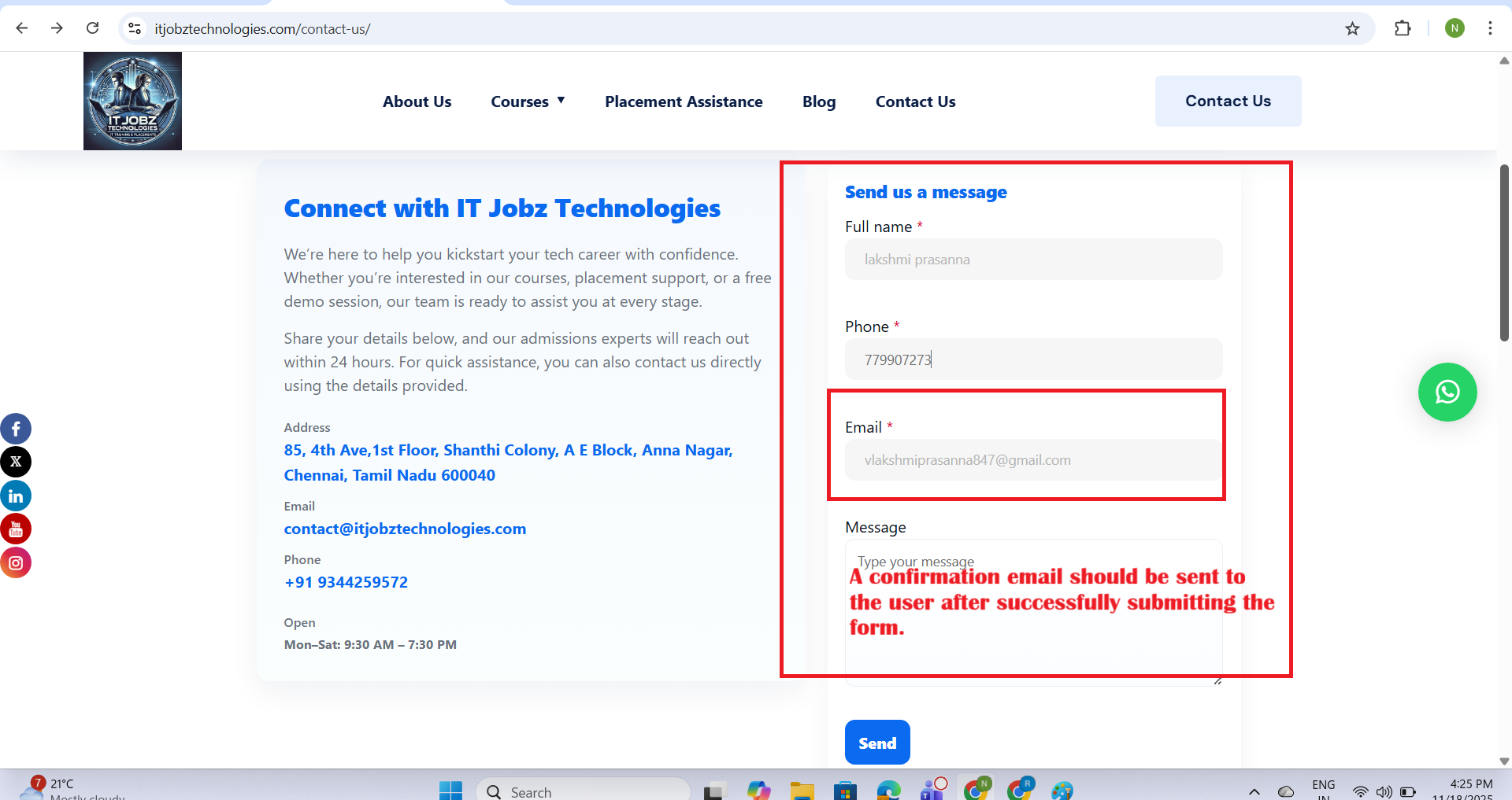 - After entering all valid details in the Send Us a Message form (Full Name, Phone Number, Email, and Message) and clicking the Send button, No confirmation email is received by the user.
