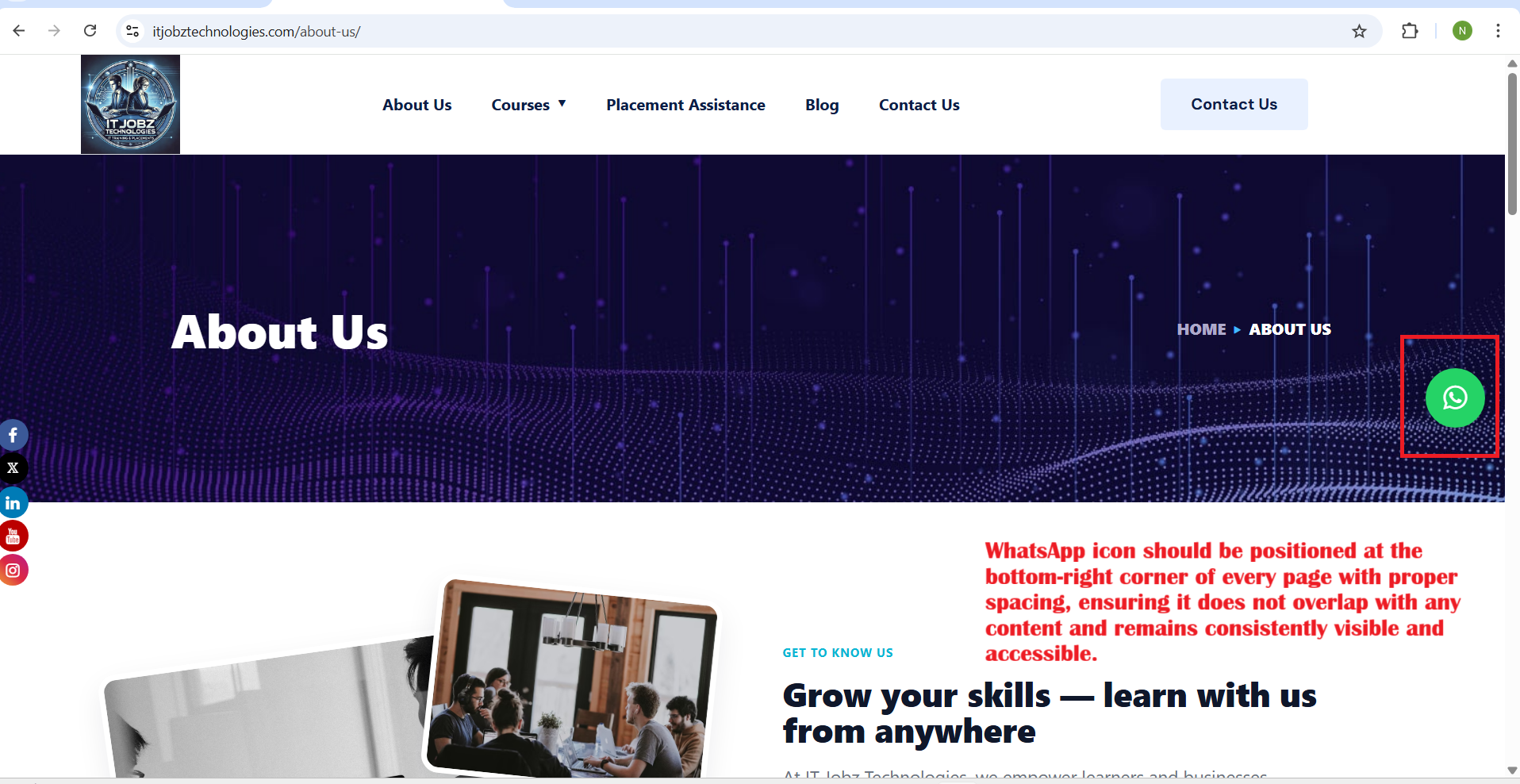 - Instead, the WhatsApp icon should be positioned at the bottom-right corner of every page with proper spacing, ensuring it does not overlap with any content and remains consistently visible and accessible.
