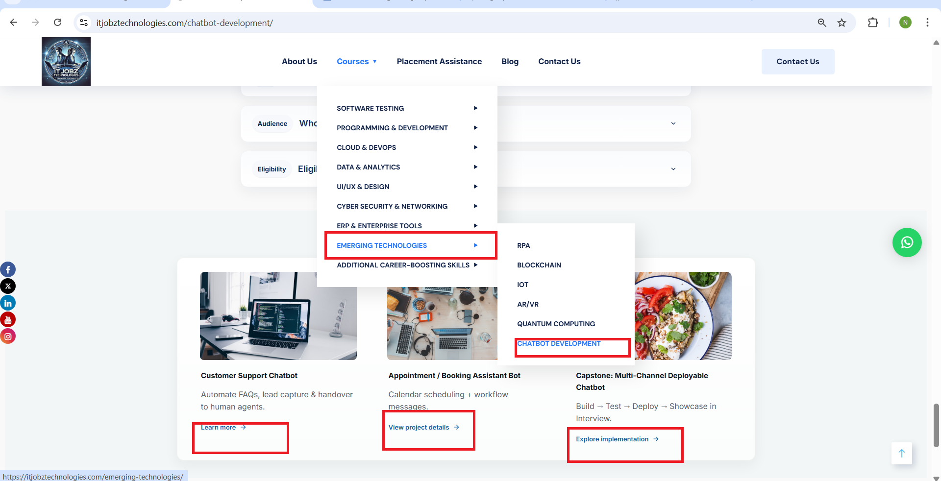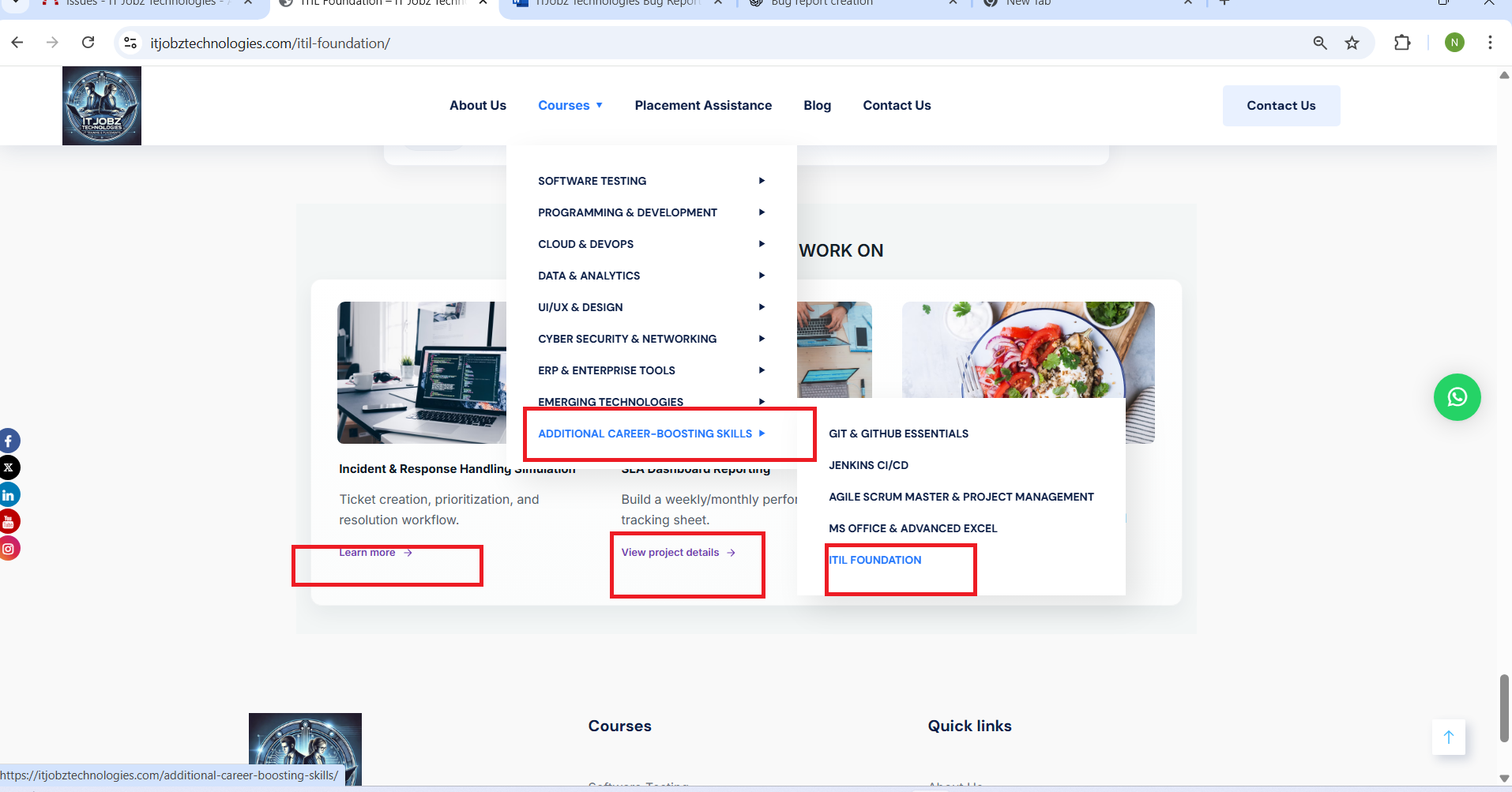 openCourses → Emerging Technologies (Chatbot Development) / Additional Career-Boosting Skills (ITIL Foundation) – “Projects You Will Work On” Section – Links Redirect to Top of Page Issue: