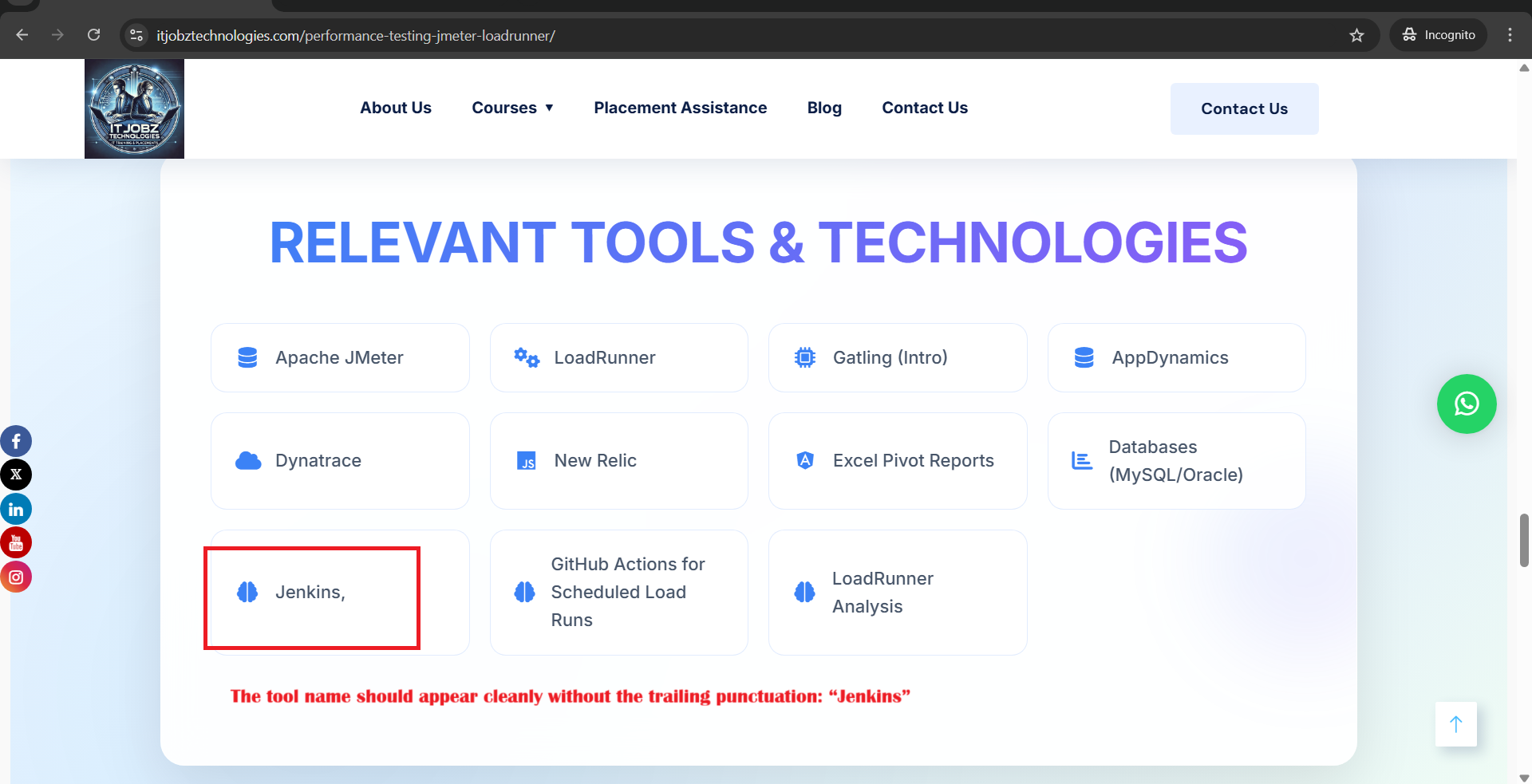 openCourses drop down -- Software Testing -- Performance Testing (JMeter, LoadRunner) page scroll down – relevant tools and technologies section -- Jenkins,” Unnecessary comma at the end issue: