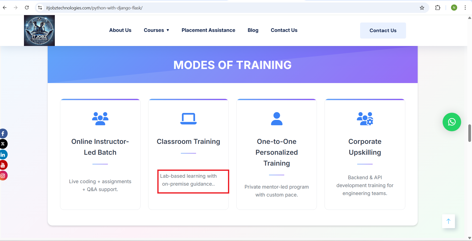 openCourses drop down – Programming & Development(Python with Django / Flask) page scroll down – Modes of Training section – Classroom Training card on-premise guidance.. Period issue: