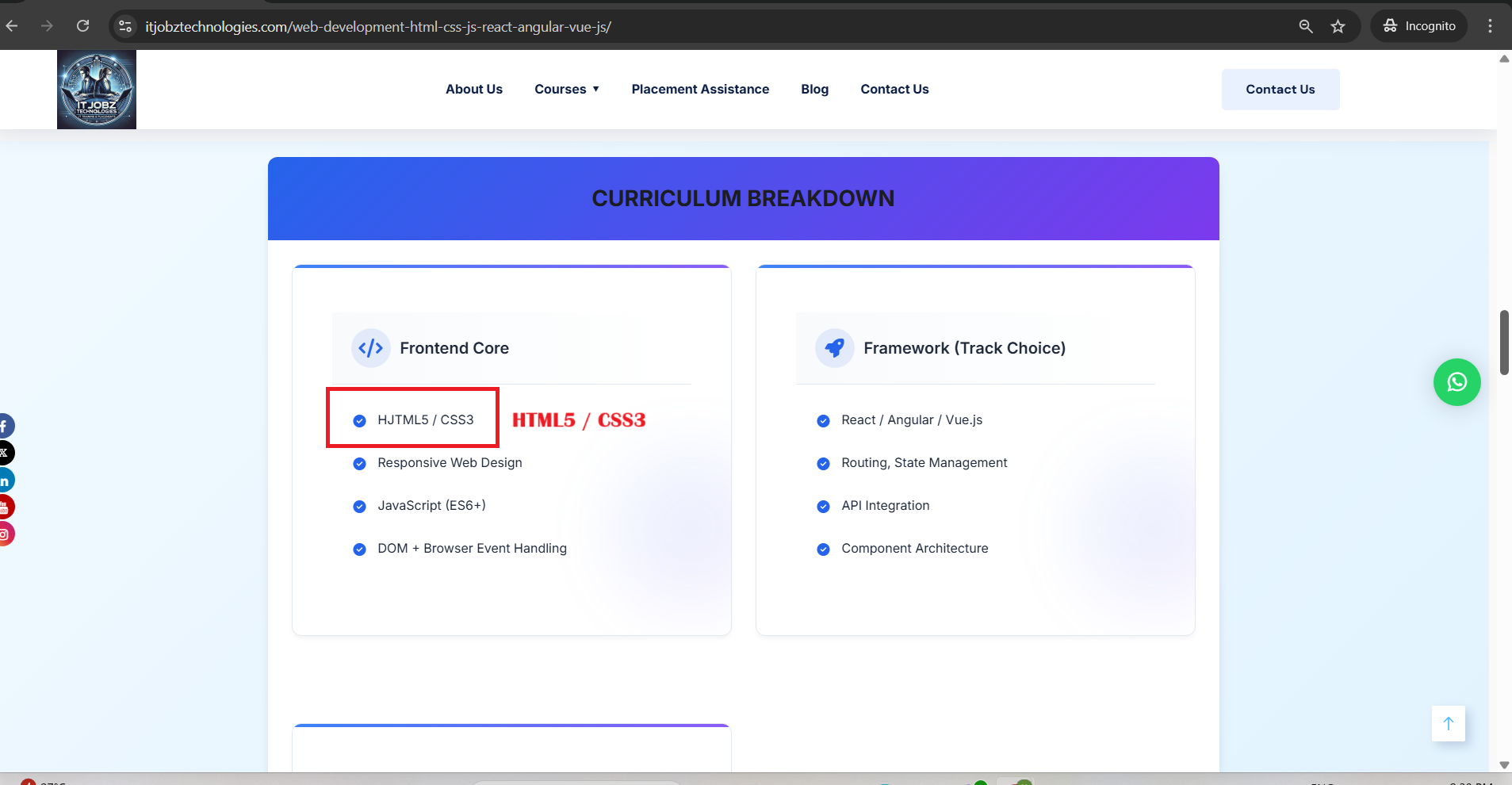 openCourses drop down – Programming & Development (Web Development) page scroll down -- CURRICULUM BREAKDOWN section – Frontend Core card HJTML5 / CSS3 spelling mistake issue: