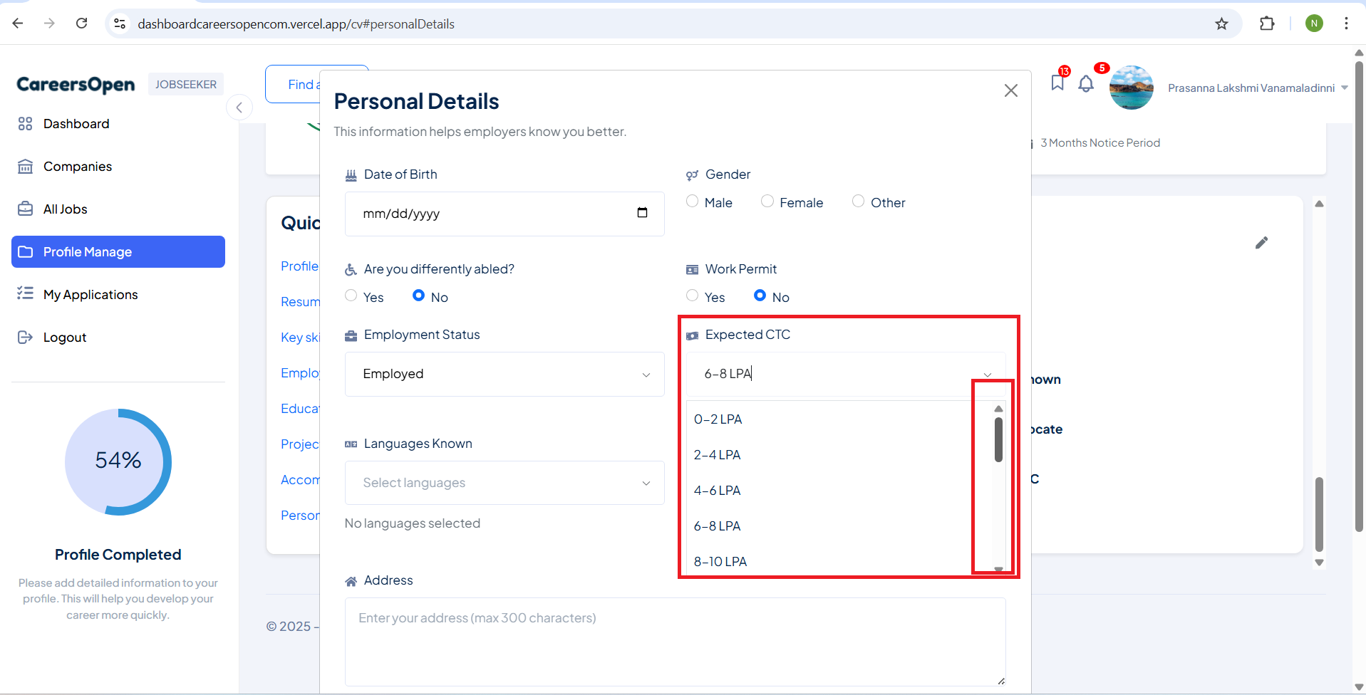 - In the Personal Details section under Expected CTC, the dropdown list opens, but the drag/scroll button is not working. The user is unable to scroll through the list using the scrollbar.