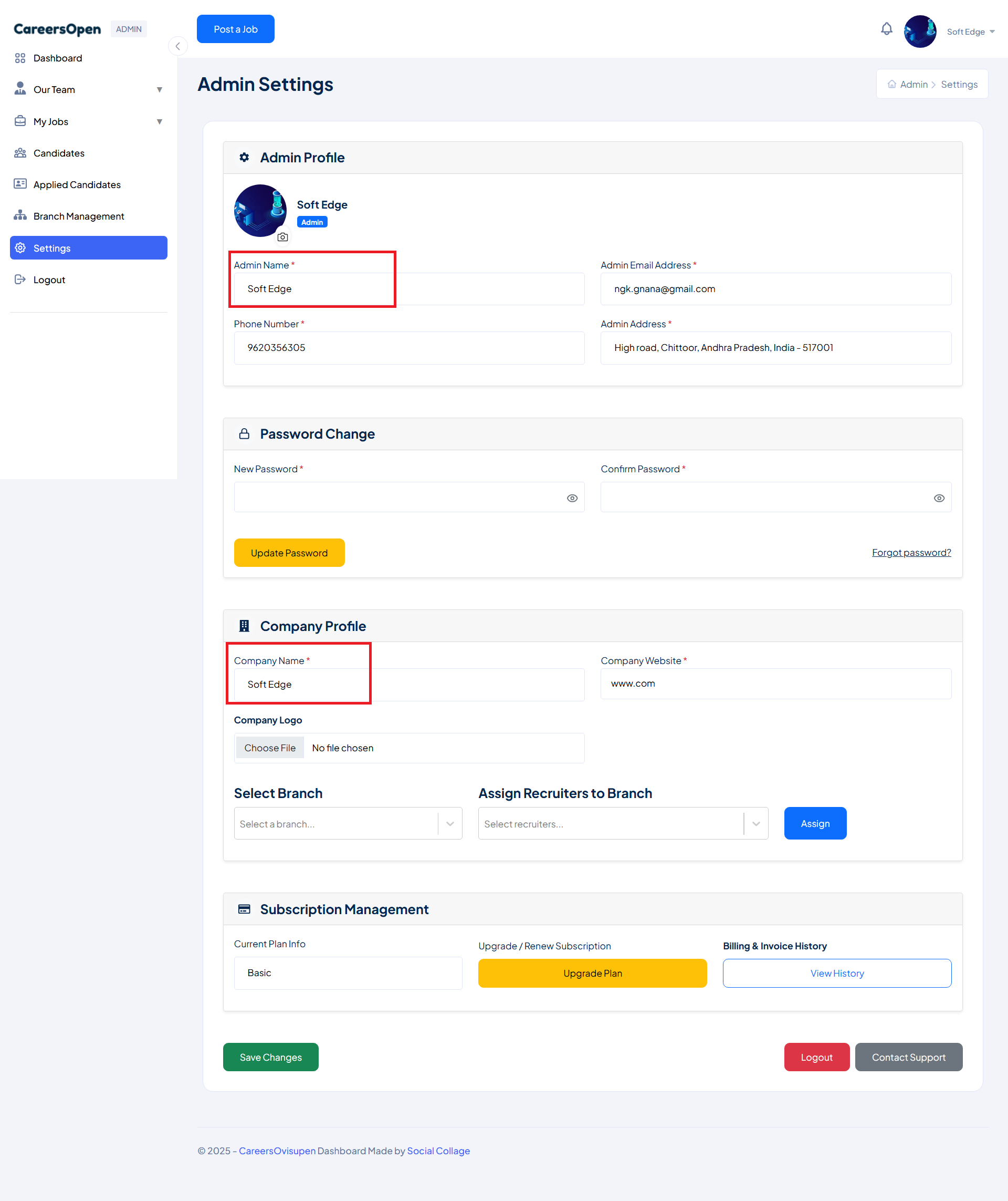 - Instead, the Admin Name field should display only the admin’s actual name. The Company Name field should display only the Company’s registered name. Both fields must show different and correct values from their respective data sources.