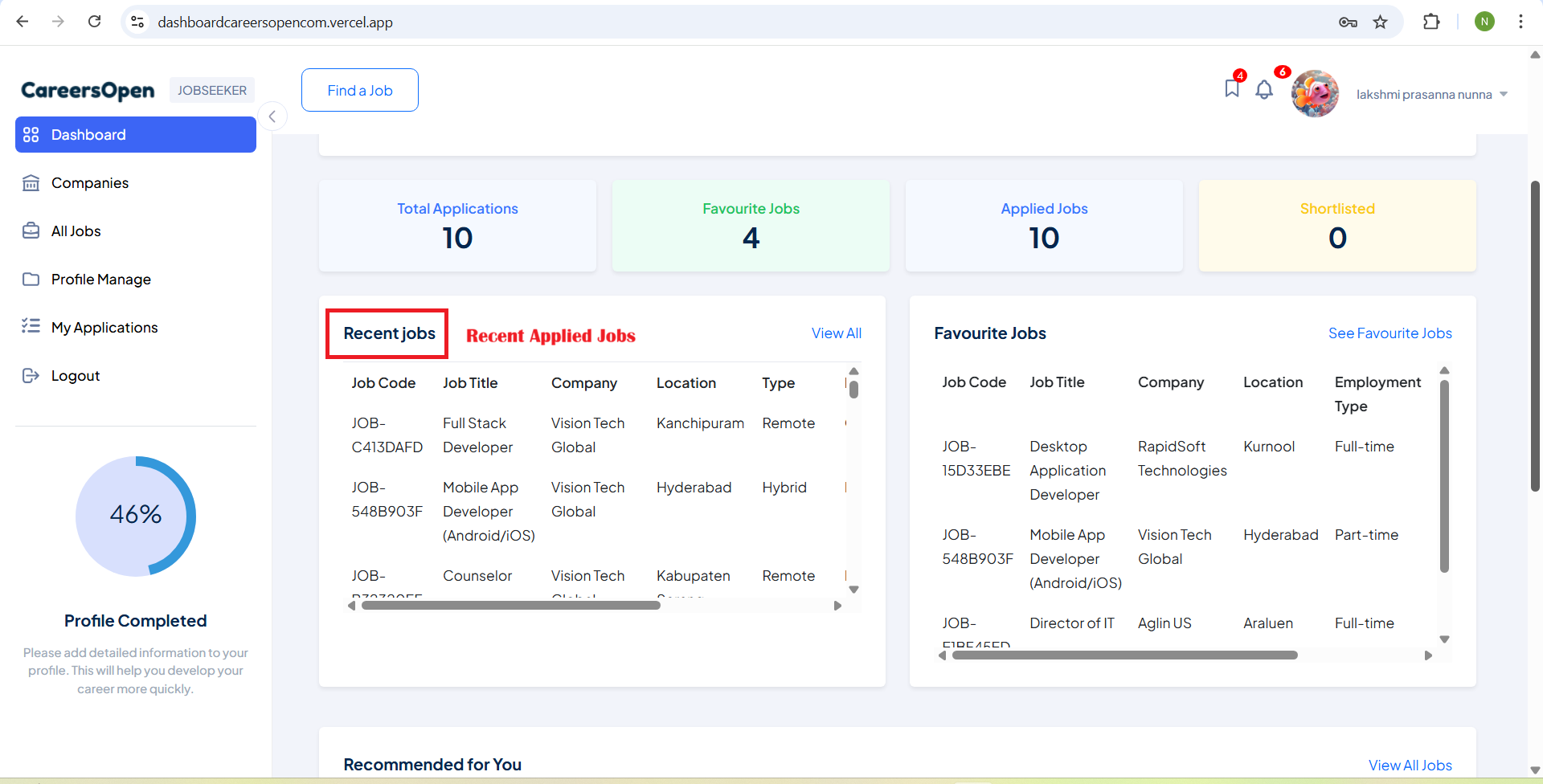 closed(Job Seeker) Dashboard – Recent Jobs heading should be renamed to Recent Applied Jobs issue: