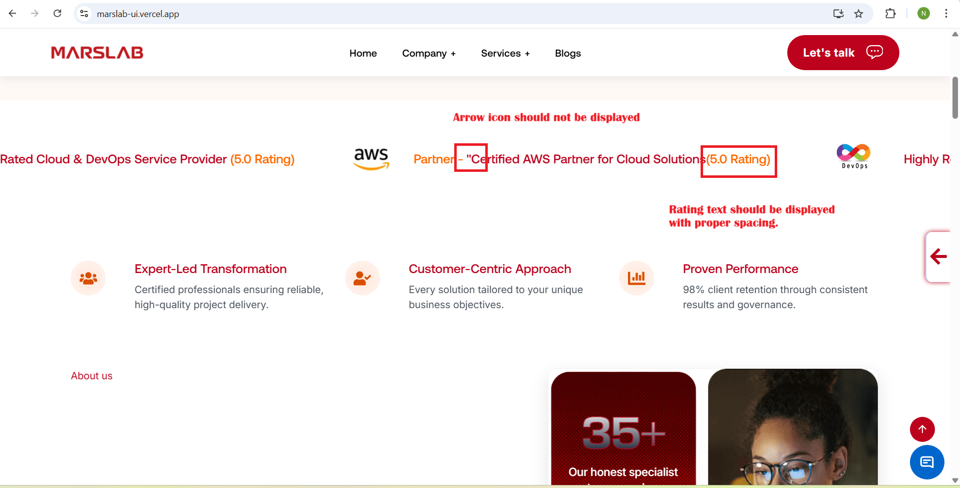 openHome page – scroll down -- AWS Partner Section – Unwanted Arrow Display & Rating Spacing Issue: