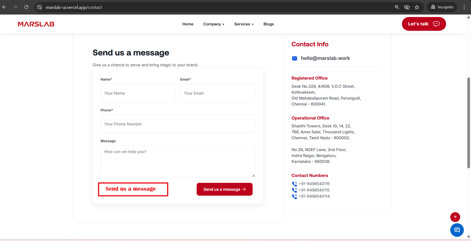 * The Send us a message button is aligned too far to the right.