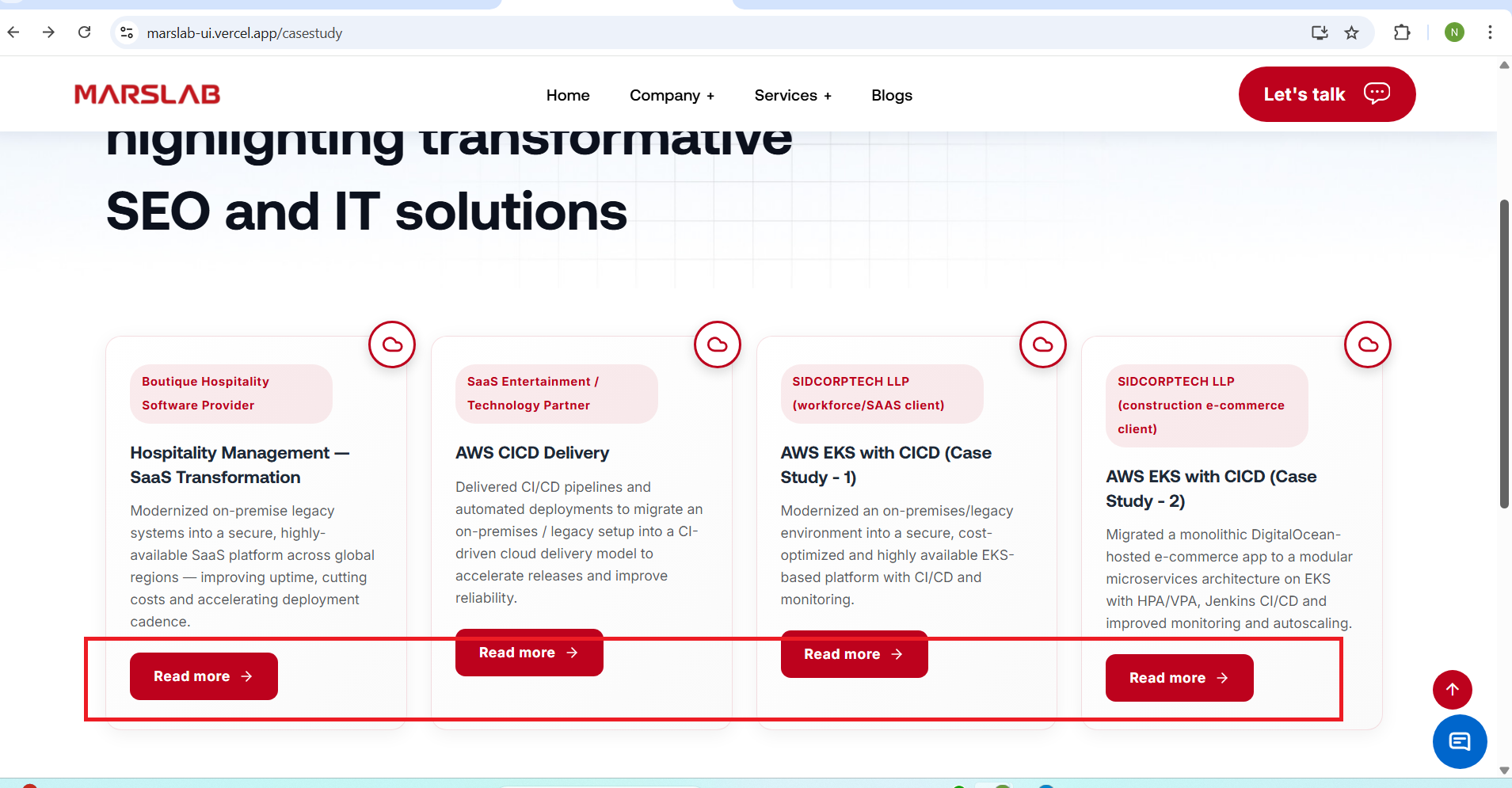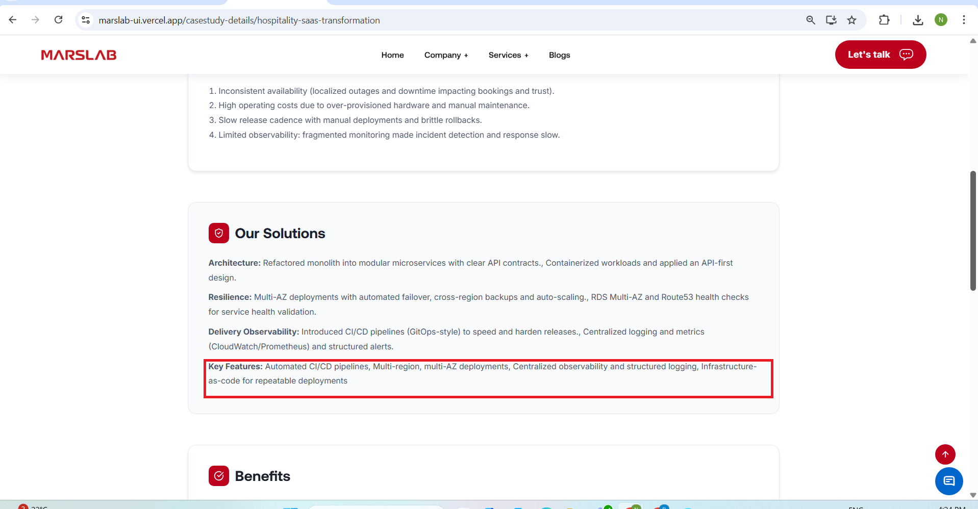* For all case study cards, when the user clicks the Read more button and navigates to the Case Study Details page, the “Key Features” content is duplicated. The same feature list appears in both the Introduction section and the Our Solutions section.