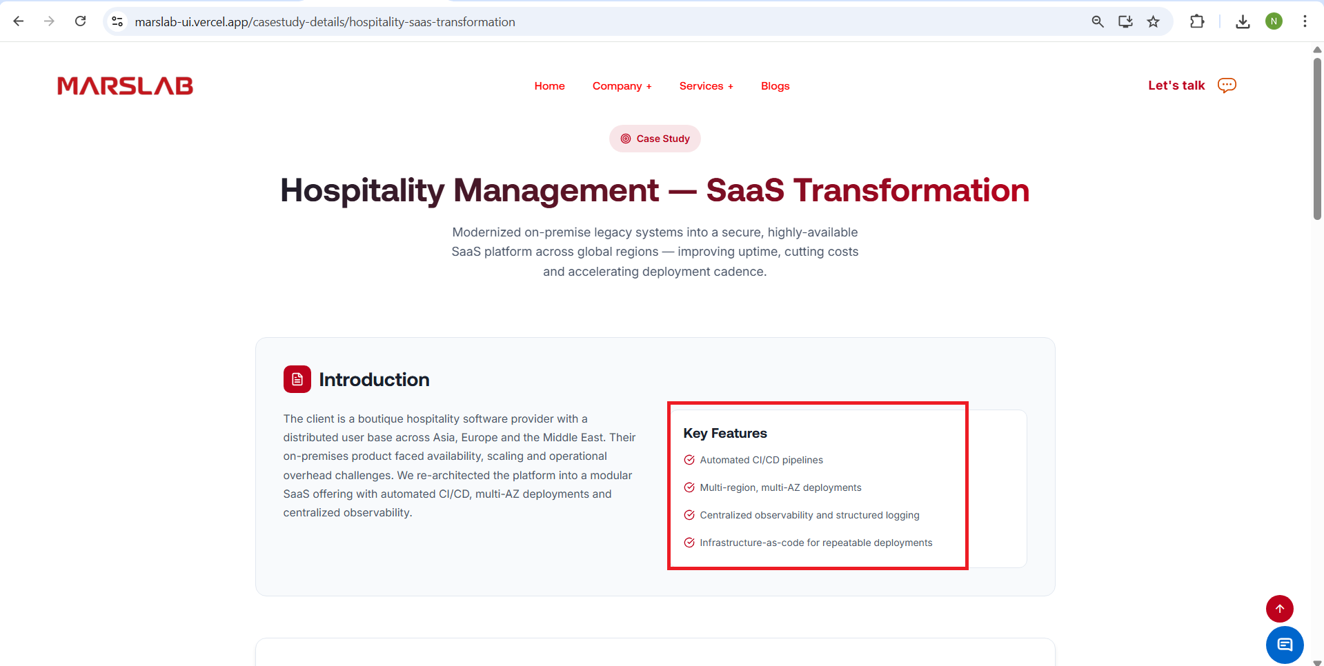 • For all case study cards, when the user clicks the Read more button and navigates to the Case Study Details page, the “Key Features” content is duplicated. The same feature list appears in both the Introduction section and the Our Solutions section.