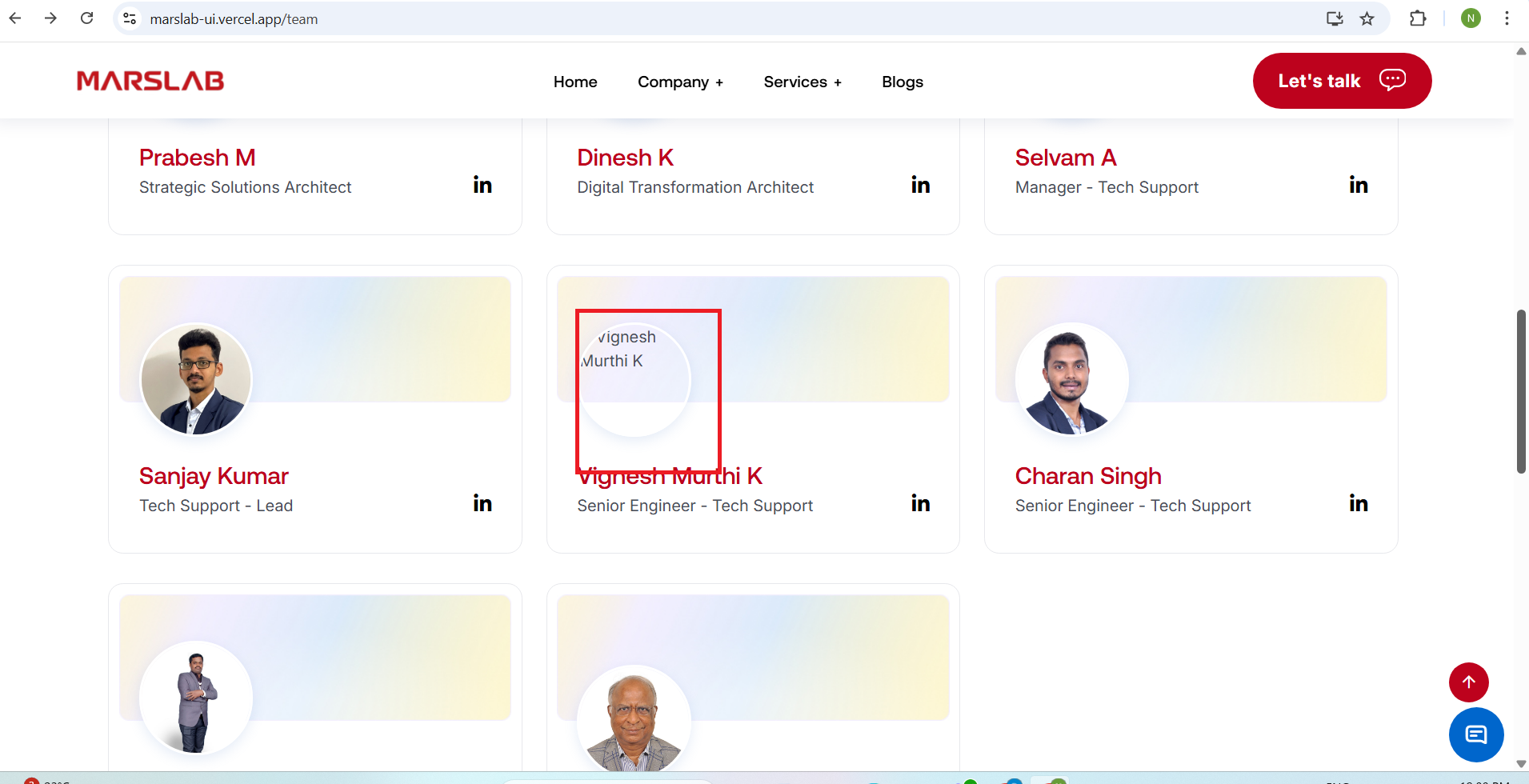 - On the Our Team (Our Leadership) page, the profile image for Vignesh Murthy K is not displayed correctly.