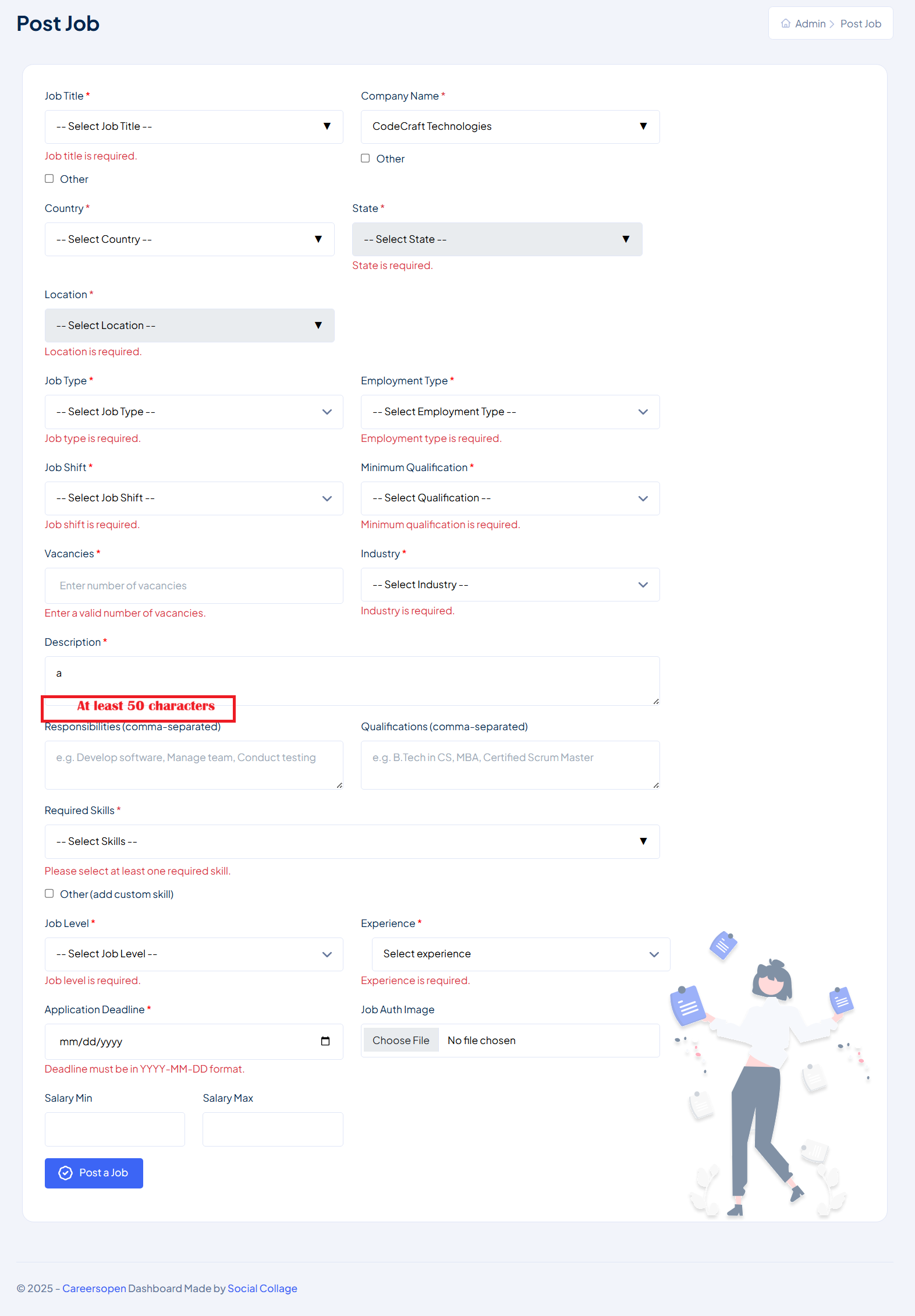 - Instead, the Job Description field should have minimum character validation (for example, at least 50 characters) and should not allow submission with a single character.