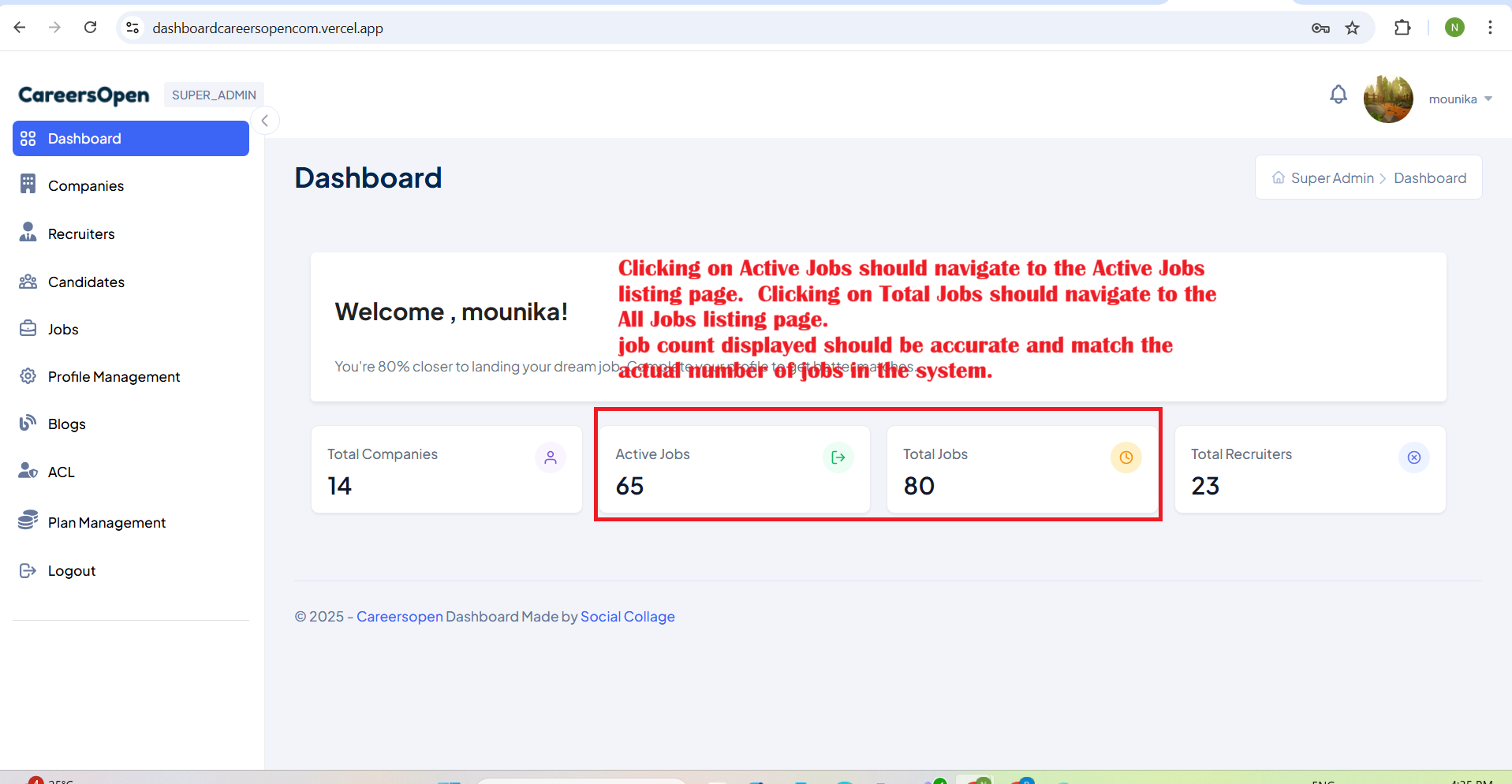 - On the (Super Admin) Dashboard page, clicking on Active Jobs or Total Jobs navigates to an incorrect page.