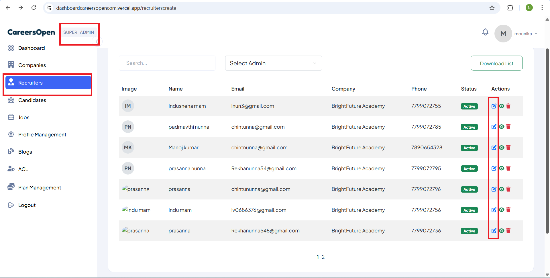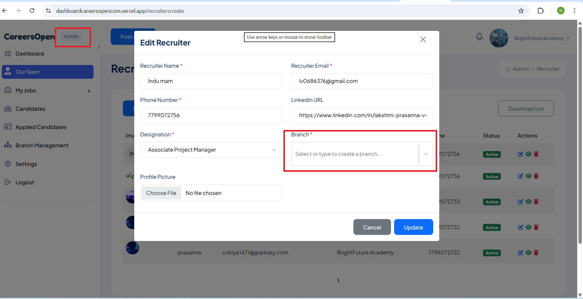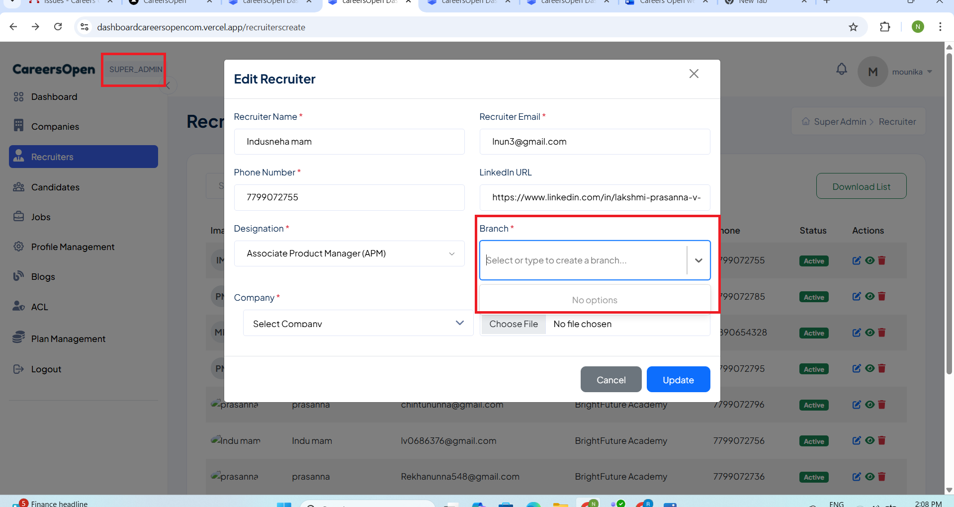 open(Admin/Super admin) Create Recruiter form --Branch Dropdown Data Not Displayed issue: