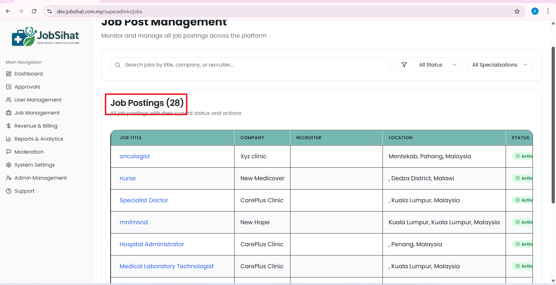 • Clicking on Total Jobs or Active Jobs redirects to the same Job Post Management page without applying filters. The job count displayed (28) does not match the dashboard count (0).