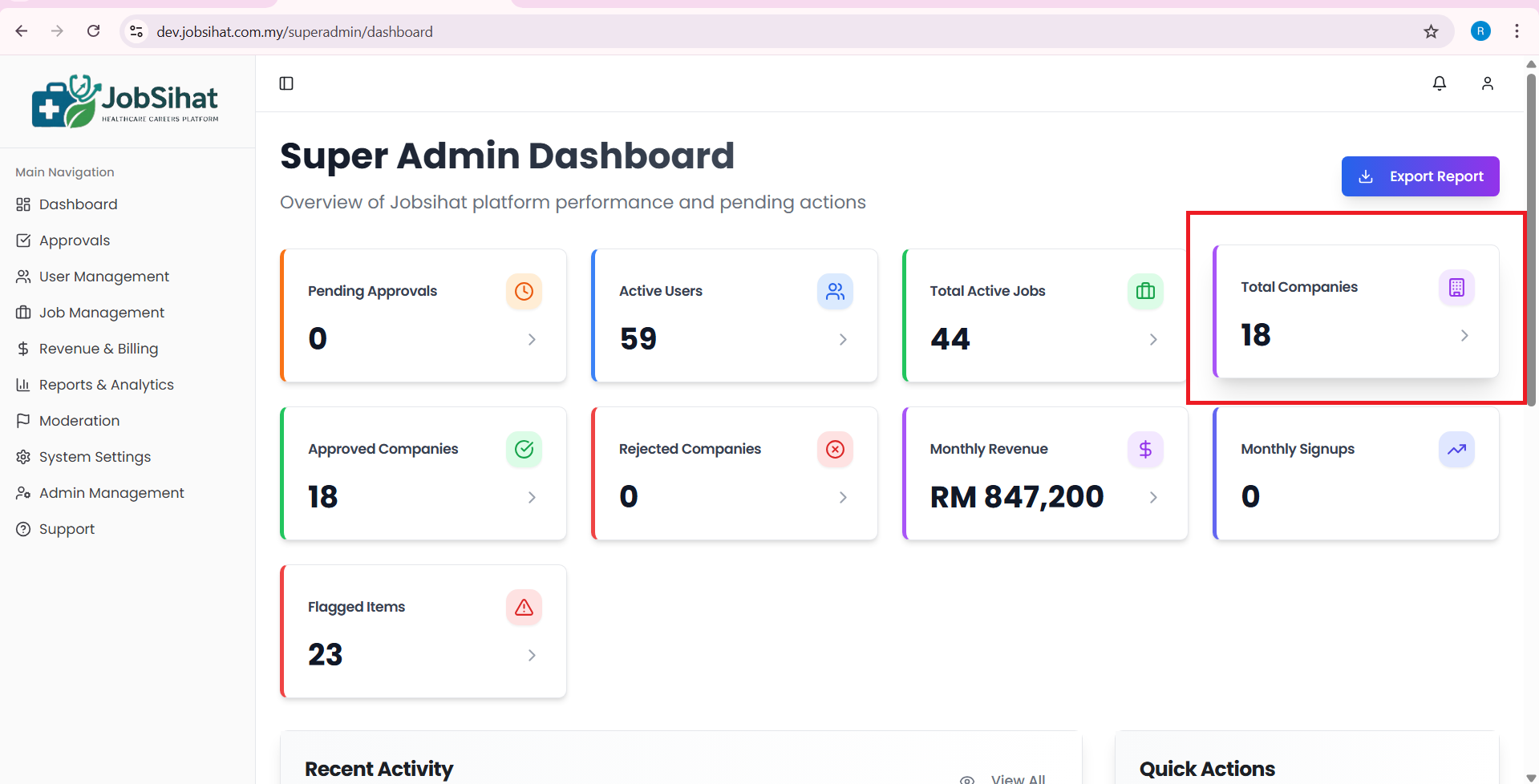 • Instead, when clicking on Total Companies, the Recruiters by Admin page should display the correct recruiter count and corresponding data.