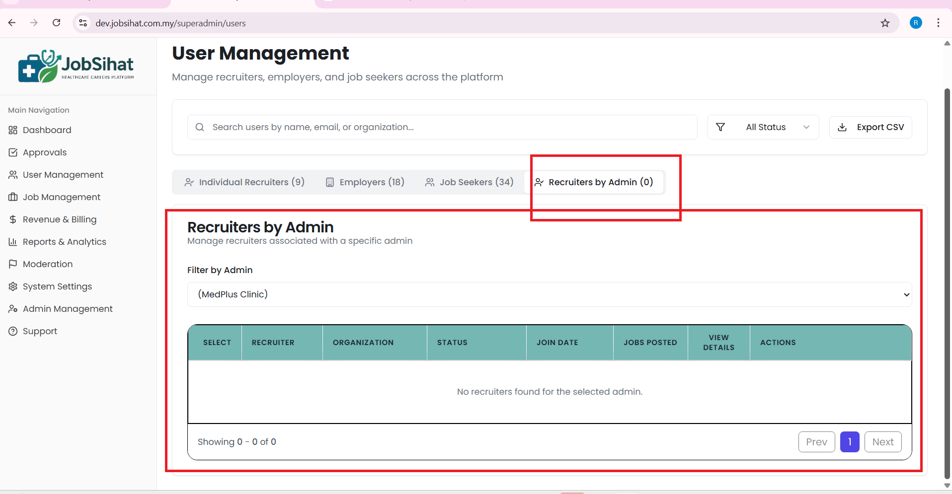 • User is redirected to User Management → Recruiters by Admin (0) page, and no data is displayed.