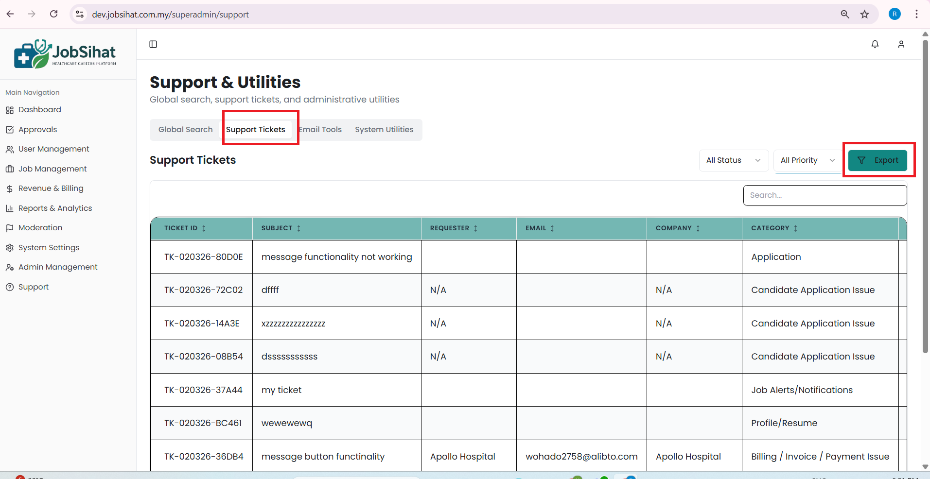 open(Super Admin) Support Tickets Page – Export Button Not Working issue: