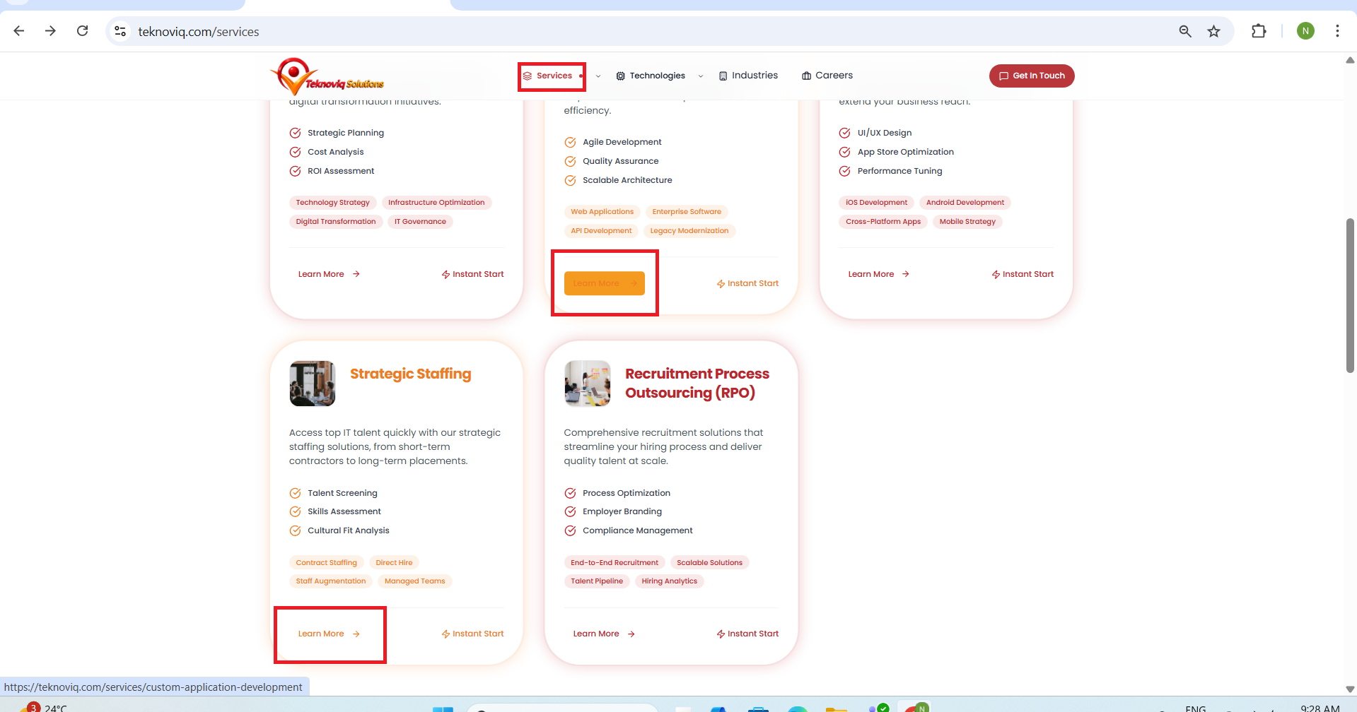 - In the Comprehensive IT Services section, when hovering over the cards (e.g., Custom Application Development, Strategic Staffing), the “Learn More” button is not clearly visible.