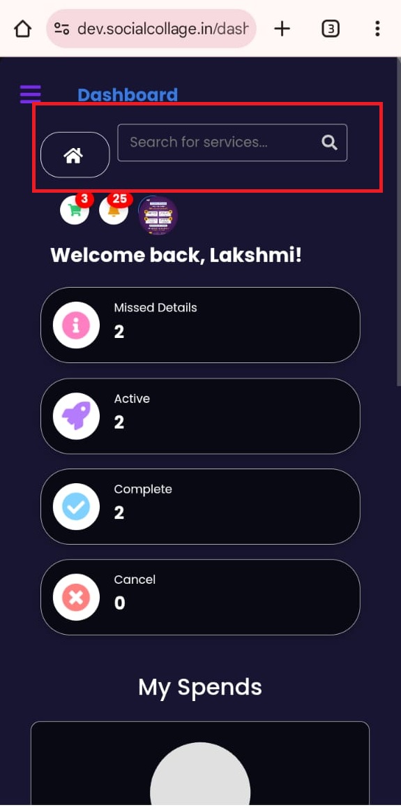 closedMobile Browser – Dashboard –Home/Search for services links alignment issue: